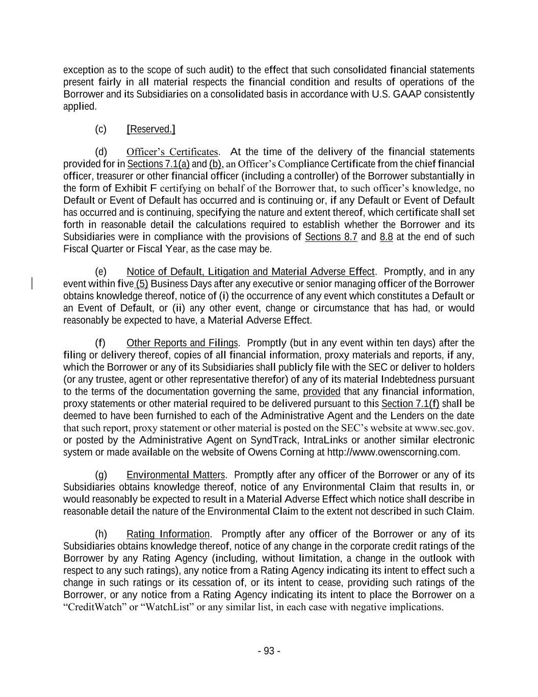 - 93 - exception as to the scope of such audit) to the effect that such consolidated financial statements present fairly in all material respects the financial condition and results of operations of the Borrower and its Subsidiaries on a consolidated basis in accordance with U.S. GAAP consistently applied. (c) [Reserved.] (d) Officer’s Certificates. At the time of the delivery of the financial statements provided for in Sections 7.1(a) and (b), an Officer’s Compliance Certificate from the chief financial officer, treasurer or other financial officer (including a controller) of the Borrower substantially in the form of Exhibit F certifying on behalf of the Borrower that, to such officer’s knowledge, no Default or Event of Default has occurred and is continuing or, if any Default or Event of Default has occurred and is continuing, specifying the nature and extent thereof, which certificate shall set forth in reasonable detail the calculations required to establish whether the Borrower and its Subsidiaries were in compliance with the provisions of Sections 8.7 and 8.8 at the end of such Fiscal Quarter or Fiscal Year, as the case may be. (e) Notice of Default, Litigation and Material Adverse Effect. Promptly, and in any event within five (5) Business Days after any executive or senior managing officer of the Borrower obtains knowledge thereof, notice of (i) the occurrence of any event which constitutes a Default or an Event of Default, or (ii) any other event, change or circumstance that has had, or would reasonably be expected to have, a Material Adverse Effect. (f) Other Reports and Filings. Promptly (but in any event within ten days) after the filing or delivery thereof, copies of all financial information, proxy materials and reports, if any, which the Borrower or any of its Subsidiaries shall publicly file with the SEC or deliver to holders (or any trustee, agent or other representative therefor) of any of its material Indebtedness pursuant to the terms of the documentation governing the same, provided that any financial information, proxy statements or other material required to be delivered pursuant to this Section 7.1(f) shall be deemed to have been furnished to each of the Administrative Agent and the Lenders on the date that such report, proxy statement or other material is posted on the SEC’s website at www.sec.gov. or posted by the Administrative Agent on SyndTrack, IntraLinks or another similar electronic system or made available on the website of Owens Corning at http://www.owenscorning.com. (g) Environmental Matters. Promptly after any officer of the Borrower or any of its Subsidiaries obtains knowledge thereof, notice of any Environmental Claim that results in, or would reasonably be expected to result in a Material Adverse Effect which notice shall describe in reasonable detail the nature of the Environmental Claim to the extent not described in such Claim. (h) Rating Information. Promptly after any officer of the Borrower or any of its Subsidiaries obtains knowledge thereof, notice of any change in the corporate credit ratings of the Borrower by any Rating Agency (including, without limitation, a change in the outlook with respect to any such ratings), any notice from a Rating Agency indicating its intent to effect such a change in such ratings or its cessation of, or its intent to cease, providing such ratings of the Borrower, or any notice from a Rating Agency indicating its intent to place the Borrower on a “CreditWatch” or “WatchList” or any similar list, in each case with negative implications.