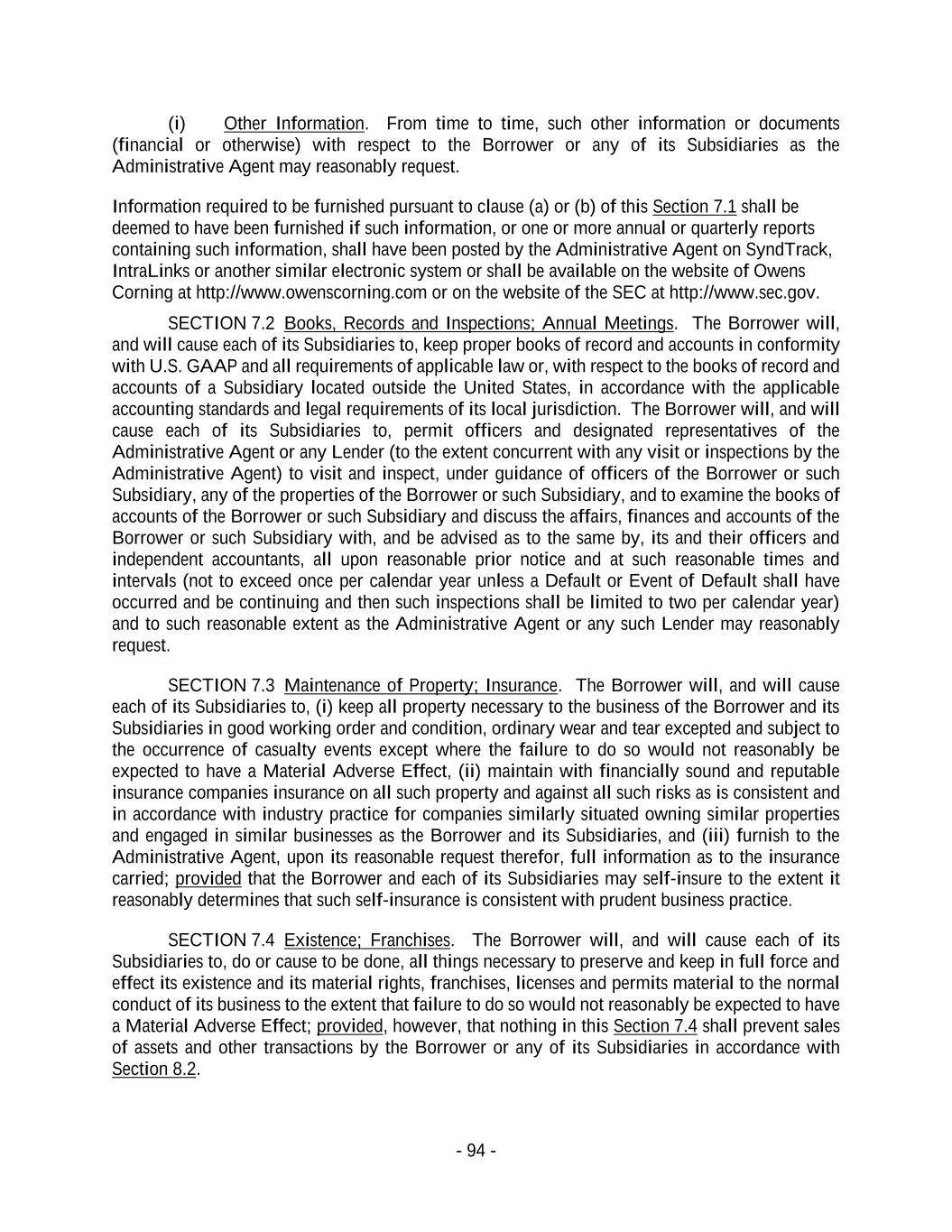 - 94 - (i) Other Information. From time to time, such other information or documents (financial or otherwise) with respect to the Borrower or any of its Subsidiaries as the Administrative Agent may reasonably request. Information required to be furnished pursuant to clause (a) or (b) of this Section 7.1 shall be deemed to have been furnished if such information, or one or more annual or quarterly reports containing such information, shall have been posted by the Administrative Agent on SyndTrack, IntraLinks or another similar electronic system or shall be available on the website of Owens Corning at http://www.owenscorning.com or on the website of the SEC at http://www.sec.gov. SECTION 7.2 Books, Records and Inspections; Annual Meetings. The Borrower will, and will cause each of its Subsidiaries to, keep proper books of record and accounts in conformity with U.S. GAAP and all requirements of applicable law or, with respect to the books of record and accounts of a Subsidiary located outside the United States, in accordance with the applicable accounting standards and legal requirements of its local jurisdiction. The Borrower will, and will cause each of its Subsidiaries to, permit officers and designated representatives of the Administrative Agent or any Lender (to the extent concurrent with any visit or inspections by the Administrative Agent) to visit and inspect, under guidance of officers of the Borrower or such Subsidiary, any of the properties of the Borrower or such Subsidiary, and to examine the books of accounts of the Borrower or such Subsidiary and discuss the affairs, finances and accounts of the Borrower or such Subsidiary with, and be advised as to the same by, its and their officers and independent accountants, all upon reasonable prior notice and at such reasonable times and intervals (not to exceed once per calendar year unless a Default or Event of Default shall have occurred and be continuing and then such inspections shall be limited to two per calendar year) and to such reasonable extent as the Administrative Agent or any such Lender may reasonably request. SECTION 7.3 Maintenance of Property; Insurance. The Borrower will, and will cause each of its Subsidiaries to, (i) keep all property necessary to the business of the Borrower and its Subsidiaries in good working order and condition, ordinary wear and tear excepted and subject to the occurrence of casualty events except where the failure to do so would not reasonably be expected to have a Material Adverse Effect, (ii) maintain with financially sound and reputable insurance companies insurance on all such property and against all such risks as is consistent and in accordance with industry practice for companies similarly situated owning similar properties and engaged in similar businesses as the Borrower and its Subsidiaries, and (iii) furnish to the Administrative Agent, upon its reasonable request therefor, full information as to the insurance carried; provided that the Borrower and each of its Subsidiaries may self-insure to the extent it reasonably determines that such self-insurance is consistent with prudent business practice. SECTION 7.4 Existence; Franchises. The Borrower will, and will cause each of its Subsidiaries to, do or cause to be done, all things necessary to preserve and keep in full force and effect its existence and its material rights, franchises, licenses and permits material to the normal conduct of its business to the extent that failure to do so would not reasonably be expected to have a Material Adverse Effect; provided, however, that nothing in this Section 7.4 shall prevent sales of assets and other transactions by the Borrower or any of its Subsidiaries in accordance with Section 8.2.