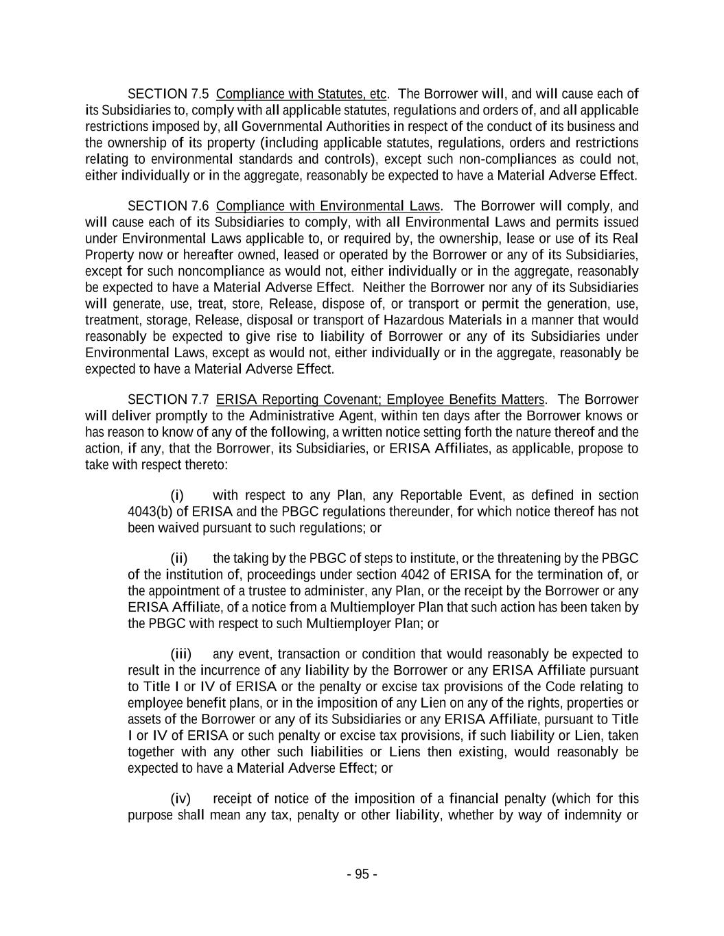 - 95 - SECTION 7.5 Compliance with Statutes, etc. The Borrower will, and will cause each of its Subsidiaries to, comply with all applicable statutes, regulations and orders of, and all applicable restrictions imposed by, all Governmental Authorities in respect of the conduct of its business and the ownership of its property (including applicable statutes, regulations, orders and restrictions relating to environmental standards and controls), except such non-compliances as could not, either individually or in the aggregate, reasonably be expected to have a Material Adverse Effect. SECTION 7.6 Compliance with Environmental Laws. The Borrower will comply, and will cause each of its Subsidiaries to comply, with all Environmental Laws and permits issued under Environmental Laws applicable to, or required by, the ownership, lease or use of its Real Property now or hereafter owned, leased or operated by the Borrower or any of its Subsidiaries, except for such noncompliance as would not, either individually or in the aggregate, reasonably be expected to have a Material Adverse Effect. Neither the Borrower nor any of its Subsidiaries will generate, use, treat, store, Release, dispose of, or transport or permit the generation, use, treatment, storage, Release, disposal or transport of Hazardous Materials in a manner that would reasonably be expected to give rise to liability of Borrower or any of its Subsidiaries under Environmental Laws, except as would not, either individually or in the aggregate, reasonably be expected to have a Material Adverse Effect. SECTION 7.7 ERISA Reporting Covenant; Employee Benefits Matters. The Borrower will deliver promptly to the Administrative Agent, within ten days after the Borrower knows or has reason to know of any of the following, a written notice setting forth the nature thereof and the action, if any, that the Borrower, its Subsidiaries, or ERISA Affiliates, as applicable, propose to take with respect thereto: (i) with respect to any Plan, any Reportable Event, as defined in section 4043(b) of ERISA and the PBGC regulations thereunder, for which notice thereof has not been waived pursuant to such regulations; or (ii) the taking by the PBGC of steps to institute, or the threatening by the PBGC of the institution of, proceedings under section 4042 of ERISA for the termination of, or the appointment of a trustee to administer, any Plan, or the receipt by the Borrower or any ERISA Affiliate, of a notice from a Multiemployer Plan that such action has been taken by the PBGC with respect to such Multiemployer Plan; or (iii) any event, transaction or condition that would reasonably be expected to result in the incurrence of any liability by the Borrower or any ERISA Affiliate pursuant to Title I or IV of ERISA or the penalty or excise tax provisions of the Code relating to employee benefit plans, or in the imposition of any Lien on any of the rights, properties or assets of the Borrower or any of its Subsidiaries or any ERISA Affiliate, pursuant to Title I or IV of ERISA or such penalty or excise tax provisions, if such liability or Lien, taken together with any other such liabilities or Liens then existing, would reasonably be expected to have a Material Adverse Effect; or (iv) receipt of notice of the imposition of a financial penalty (which for this purpose shall mean any tax, penalty or other liability, whether by way of indemnity or