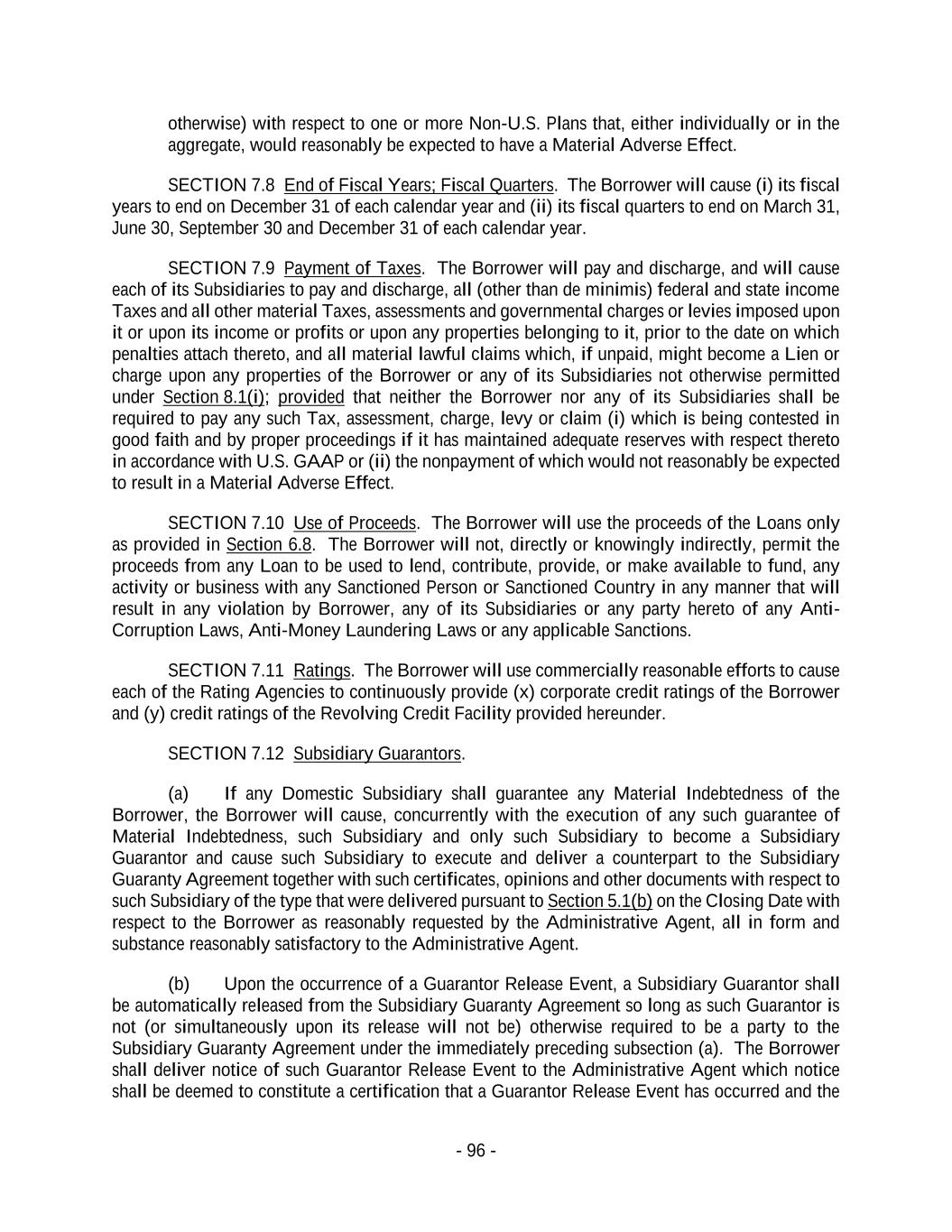 - 96 - otherwise) with respect to one or more Non-U.S. Plans that, either individually or in the aggregate, would reasonably be expected to have a Material Adverse Effect. SECTION 7.8 End of Fiscal Years; Fiscal Quarters. The Borrower will cause (i) its fiscal years to end on December 31 of each calendar year and (ii) its fiscal quarters to end on March 31, June 30, September 30 and December 31 of each calendar year. SECTION 7.9 Payment of Taxes. The Borrower will pay and discharge, and will cause each of its Subsidiaries to pay and discharge, all (other than de minimis) federal and state income Taxes and all other material Taxes, assessments and governmental charges or levies imposed upon it or upon its income or profits or upon any properties belonging to it, prior to the date on which penalties attach thereto, and all material lawful claims which, if unpaid, might become a Lien or charge upon any properties of the Borrower or any of its Subsidiaries not otherwise permitted under Section 8.1(i); provided that neither the Borrower nor any of its Subsidiaries shall be required to pay any such Tax, assessment, charge, levy or claim (i) which is being contested in good faith and by proper proceedings if it has maintained adequate reserves with respect thereto in accordance with U.S. GAAP or (ii) the nonpayment of which would not reasonably be expected to result in a Material Adverse Effect. SECTION 7.10 Use of Proceeds. The Borrower will use the proceeds of the Loans only as provided in Section 6.8. The Borrower will not, directly or knowingly indirectly, permit the proceeds from any Loan to be used to lend, contribute, provide, or make available to fund, any activity or business with any Sanctioned Person or Sanctioned Country in any manner that will result in any violation by Borrower, any of its Subsidiaries or any party hereto of any Anti- Corruption Laws, Anti-Money Laundering Laws or any applicable Sanctions. SECTION 7.11 Ratings. The Borrower will use commercially reasonable efforts to cause each of the Rating Agencies to continuously provide (x) corporate credit ratings of the Borrower and (y) credit ratings of the Revolving Credit Facility provided hereunder. SECTION 7.12 Subsidiary Guarantors. (a) If any Domestic Subsidiary shall guarantee any Material Indebtedness of the Borrower, the Borrower will cause, concurrently with the execution of any such guarantee of Material Indebtedness, such Subsidiary and only such Subsidiary to become a Subsidiary Guarantor and cause such Subsidiary to execute and deliver a counterpart to the Subsidiary Guaranty Agreement together with such certificates, opinions and other documents with respect to such Subsidiary of the type that were delivered pursuant to Section 5.1(b) on the Closing Date with respect to the Borrower as reasonably requested by the Administrative Agent, all in form and substance reasonably satisfactory to the Administrative Agent. (b) Upon the occurrence of a Guarantor Release Event, a Subsidiary Guarantor shall be automatically released from the Subsidiary Guaranty Agreement so long as such Guarantor is not (or simultaneously upon its release will not be) otherwise required to be a party to the Subsidiary Guaranty Agreement under the immediately preceding subsection (a). The Borrower shall deliver notice of such Guarantor Release Event to the Administrative Agent which notice shall be deemed to constitute a certification that a Guarantor Release Event has occurred and the