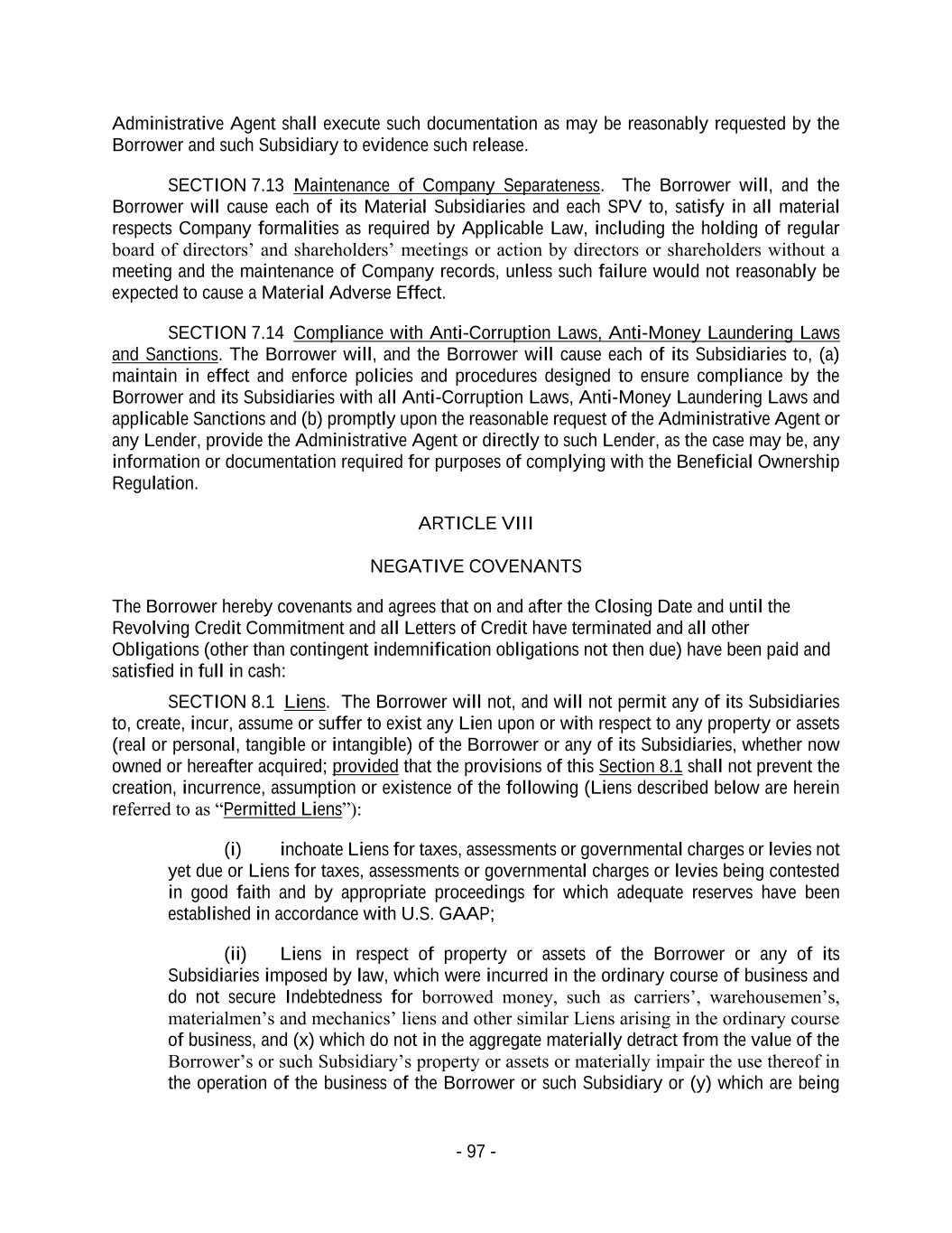 - 97 - Administrative Agent shall execute such documentation as may be reasonably requested by the Borrower and such Subsidiary to evidence such release. SECTION 7.13 Maintenance of Company Separateness. The Borrower will, and the Borrower will cause each of its Material Subsidiaries and each SPV to, satisfy in all material respects Company formalities as required by Applicable Law, including the holding of regular board of directors’ and shareholders’ meetings or action by directors or shareholders without a meeting and the maintenance of Company records, unless such failure would not reasonably be expected to cause a Material Adverse Effect. SECTION 7.14 Compliance with Anti-Corruption Laws, Anti-Money Laundering Laws and Sanctions. The Borrower will, and the Borrower will cause each of its Subsidiaries to, (a) maintain in effect and enforce policies and procedures designed to ensure compliance by the Borrower and its Subsidiaries with all Anti-Corruption Laws, Anti-Money Laundering Laws and applicable Sanctions and (b) promptly upon the reasonable request of the Administrative Agent or any Lender, provide the Administrative Agent or directly to such Lender, as the case may be, any information or documentation required for purposes of complying with the Beneficial Ownership Regulation. ARTICLE VIII NEGATIVE COVENANTS The Borrower hereby covenants and agrees that on and after the Closing Date and until the Revolving Credit Commitment and all Letters of Credit have terminated and all other Obligations (other than contingent indemnification obligations not then due) have been paid and satisfied in full in cash: SECTION 8.1 Liens. The Borrower will not, and will not permit any of its Subsidiaries to, create, incur, assume or suffer to exist any Lien upon or with respect to any property or assets (real or personal, tangible or intangible) of the Borrower or any of its Subsidiaries, whether now owned or hereafter acquired; provided that the provisions of this Section 8.1 shall not prevent the creation, incurrence, assumption or existence of the following (Liens described below are herein referred to as “Permitted Liens”): (i) inchoate Liens for taxes, assessments or governmental charges or levies not yet due or Liens for taxes, assessments or governmental charges or levies being contested in good faith and by appropriate proceedings for which adequate reserves have been established in accordance with U.S. GAAP; (ii) Liens in respect of property or assets of the Borrower or any of its Subsidiaries imposed by law, which were incurred in the ordinary course of business and do not secure Indebtedness for borrowed money, such as carriers’, warehousemen’s, materialmen’s and mechanics’ liens and other similar Liens arising in the ordinary course of business, and (x) which do not in the aggregate materially detract from the value of the Borrower’s or such Subsidiary’s property or assets or materially impair the use thereof in the operation of the business of the Borrower or such Subsidiary or (y) which are being