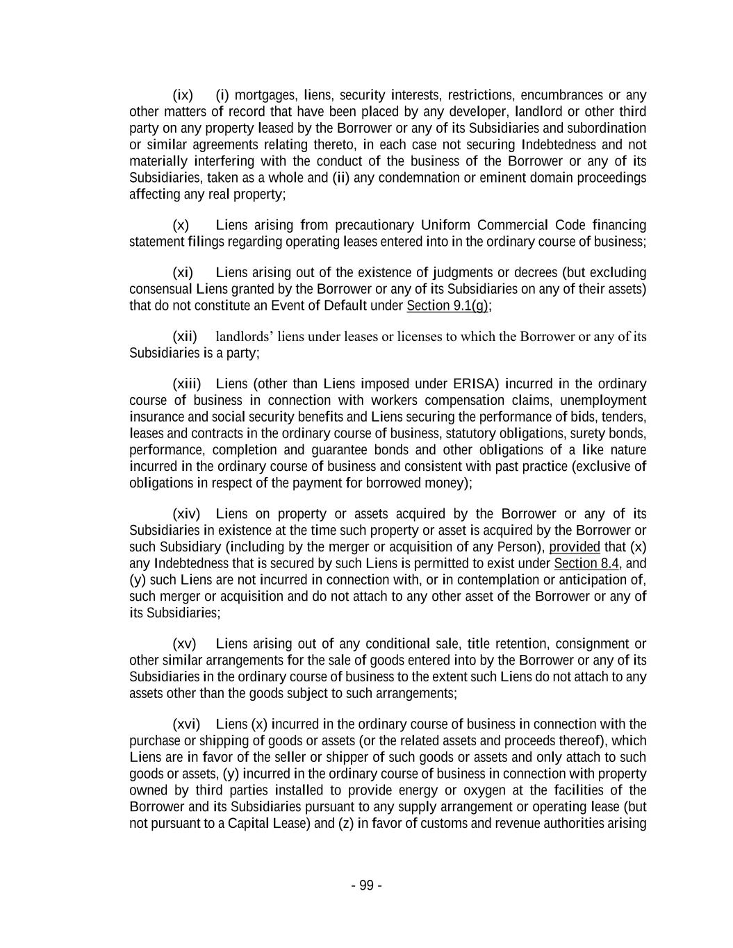 - 99 - (ix) (i) mortgages, liens, security interests, restrictions, encumbrances or any other matters of record that have been placed by any developer, landlord or other third party on any property leased by the Borrower or any of its Subsidiaries and subordination or similar agreements relating thereto, in each case not securing Indebtedness and not materially interfering with the conduct of the business of the Borrower or any of its Subsidiaries, taken as a whole and (ii) any condemnation or eminent domain proceedings affecting any real property; (x) Liens arising from precautionary Uniform Commercial Code financing statement filings regarding operating leases entered into in the ordinary course of business; (xi) Liens arising out of the existence of judgments or decrees (but excluding consensual Liens granted by the Borrower or any of its Subsidiaries on any of their assets) that do not constitute an Event of Default under Section 9.1(g); (xii) landlords’ liens under leases or licenses to which the Borrower or any of its Subsidiaries is a party; (xiii) Liens (other than Liens imposed under ERISA) incurred in the ordinary course of business in connection with workers compensation claims, unemployment insurance and social security benefits and Liens securing the performance of bids, tenders, leases and contracts in the ordinary course of business, statutory obligations, surety bonds, performance, completion and guarantee bonds and other obligations of a like nature incurred in the ordinary course of business and consistent with past practice (exclusive of obligations in respect of the payment for borrowed money); (xiv) Liens on property or assets acquired by the Borrower or any of its Subsidiaries in existence at the time such property or asset is acquired by the Borrower or such Subsidiary (including by the merger or acquisition of any Person), provided that (x) any Indebtedness that is secured by such Liens is permitted to exist under Section 8.4, and (y) such Liens are not incurred in connection with, or in contemplation or anticipation of, such merger or acquisition and do not attach to any other asset of the Borrower or any of its Subsidiaries; (xv) Liens arising out of any conditional sale, title retention, consignment or other similar arrangements for the sale of goods entered into by the Borrower or any of its Subsidiaries in the ordinary course of business to the extent such Liens do not attach to any assets other than the goods subject to such arrangements; (xvi) Liens (x) incurred in the ordinary course of business in connection with the purchase or shipping of goods or assets (or the related assets and proceeds thereof), which Liens are in favor of the seller or shipper of such goods or assets and only attach to such goods or assets, (y) incurred in the ordinary course of business in connection with property owned by third parties installed to provide energy or oxygen at the facilities of the Borrower and its Subsidiaries pursuant to any supply arrangement or operating lease (but not pursuant to a Capital Lease) and (z) in favor of customs and revenue authorities arising