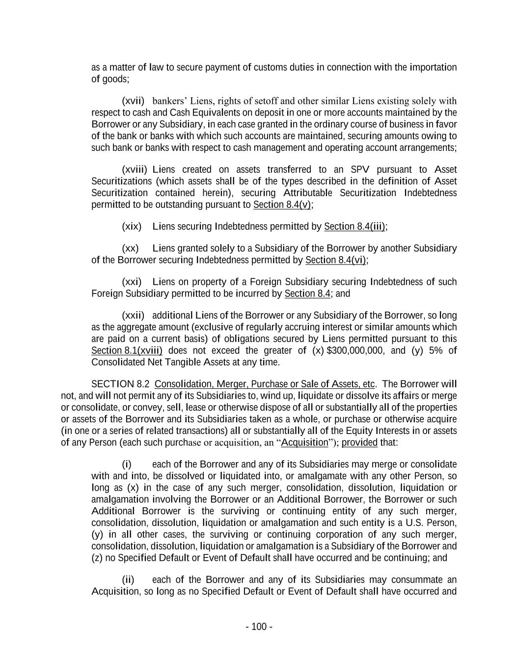 - 100 - as a matter of law to secure payment of customs duties in connection with the importation of goods; (xvii) bankers’ Liens, rights of setoff and other similar Liens existing solely with respect to cash and Cash Equivalents on deposit in one or more accounts maintained by the Borrower or any Subsidiary, in each case granted in the ordinary course of business in favor of the bank or banks with which such accounts are maintained, securing amounts owing to such bank or banks with respect to cash management and operating account arrangements; (xviii) Liens created on assets transferred to an SPV pursuant to Asset Securitizations (which assets shall be of the types described in the definition of Asset Securitization contained herein), securing Attributable Securitization Indebtedness permitted to be outstanding pursuant to Section 8.4(v); (xix) Liens securing Indebtedness permitted by Section 8.4(iii); (xx) Liens granted solely to a Subsidiary of the Borrower by another Subsidiary of the Borrower securing Indebtedness permitted by Section 8.4(vi); (xxi) Liens on property of a Foreign Subsidiary securing Indebtedness of such Foreign Subsidiary permitted to be incurred by Section 8.4; and (xxii) additional Liens of the Borrower or any Subsidiary of the Borrower, so long as the aggregate amount (exclusive of regularly accruing interest or similar amounts which are paid on a current basis) of obligations secured by Liens permitted pursuant to this Section 8.1(xviii) does not exceed the greater of (x) $300,000,000, and (y) 5% of Consolidated Net Tangible Assets at any time. SECTION 8.2 Consolidation, Merger, Purchase or Sale of Assets, etc. The Borrower will not, and will not permit any of its Subsidiaries to, wind up, liquidate or dissolve its affairs or merge or consolidate, or convey, sell, lease or otherwise dispose of all or substantially all of the properties or assets of the Borrower and its Subsidiaries taken as a whole, or purchase or otherwise acquire (in one or a series of related transactions) all or substantially all of the Equity Interests in or assets of any Person (each such purchase or acquisition, an “Acquisition”); provided that: (i) each of the Borrower and any of its Subsidiaries may merge or consolidate with and into, be dissolved or liquidated into, or amalgamate with any other Person, so long as (x) in the case of any such merger, consolidation, dissolution, liquidation or amalgamation involving the Borrower or an Additional Borrower, the Borrower or such Additional Borrower is the surviving or continuing entity of any such merger, consolidation, dissolution, liquidation or amalgamation and such entity is a U.S. Person, (y) in all other cases, the surviving or continuing corporation of any such merger, consolidation, dissolution, liquidation or amalgamation is a Subsidiary of the Borrower and (z) no Specified Default or Event of Default shall have occurred and be continuing; and (ii) each of the Borrower and any of its Subsidiaries may consummate an Acquisition, so long as no Specified Default or Event of Default shall have occurred and