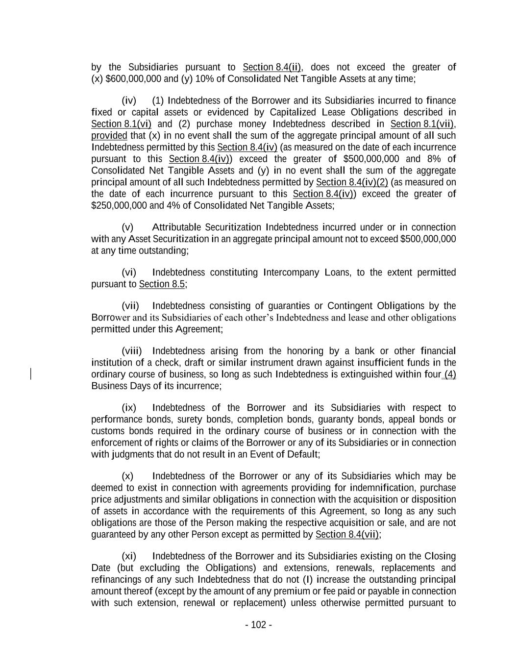 - 102 - by the Subsidiaries pursuant to Section 8.4(ii), does not exceed the greater of (x) $600,000,000 and (y) 10% of Consolidated Net Tangible Assets at any time; (iv) (1) Indebtedness of the Borrower and its Subsidiaries incurred to finance fixed or capital assets or evidenced by Capitalized Lease Obligations described in Section 8.1(vi) and (2) purchase money Indebtedness described in Section 8.1(vii), provided that (x) in no event shall the sum of the aggregate principal amount of all such Indebtedness permitted by this Section 8.4(iv) (as measured on the date of each incurrence pursuant to this Section 8.4(iv)) exceed the greater of $500,000,000 and 8% of Consolidated Net Tangible Assets and (y) in no event shall the sum of the aggregate principal amount of all such Indebtedness permitted by Section 8.4(iv)(2) (as measured on the date of each incurrence pursuant to this Section 8.4(iv)) exceed the greater of $250,000,000 and 4% of Consolidated Net Tangible Assets; (v) Attributable Securitization Indebtedness incurred under or in connection with any Asset Securitization in an aggregate principal amount not to exceed $500,000,000 at any time outstanding; (vi) Indebtedness constituting Intercompany Loans, to the extent permitted pursuant to Section 8.5; (vii) Indebtedness consisting of guaranties or Contingent Obligations by the Borrower and its Subsidiaries of each other’s Indebtedness and lease and other obligations permitted under this Agreement; (viii) Indebtedness arising from the honoring by a bank or other financial institution of a check, draft or similar instrument drawn against insufficient funds in the ordinary course of business, so long as such Indebtedness is extinguished within four (4) Business Days of its incurrence; (ix) Indebtedness of the Borrower and its Subsidiaries with respect to performance bonds, surety bonds, completion bonds, guaranty bonds, appeal bonds or customs bonds required in the ordinary course of business or in connection with the enforcement of rights or claims of the Borrower or any of its Subsidiaries or in connection with judgments that do not result in an Event of Default; (x) Indebtedness of the Borrower or any of its Subsidiaries which may be deemed to exist in connection with agreements providing for indemnification, purchase price adjustments and similar obligations in connection with the acquisition or disposition of assets in accordance with the requirements of this Agreement, so long as any such obligations are those of the Person making the respective acquisition or sale, and are not guaranteed by any other Person except as permitted by Section 8.4(vii); (xi) Indebtedness of the Borrower and its Subsidiaries existing on the Closing Date (but excluding the Obligations) and extensions, renewals, replacements and refinancings of any such Indebtedness that do not (I) increase the outstanding principal amount thereof (except by the amount of any premium or fee paid or payable in connection with such extension, renewal or replacement) unless otherwise permitted pursuant to