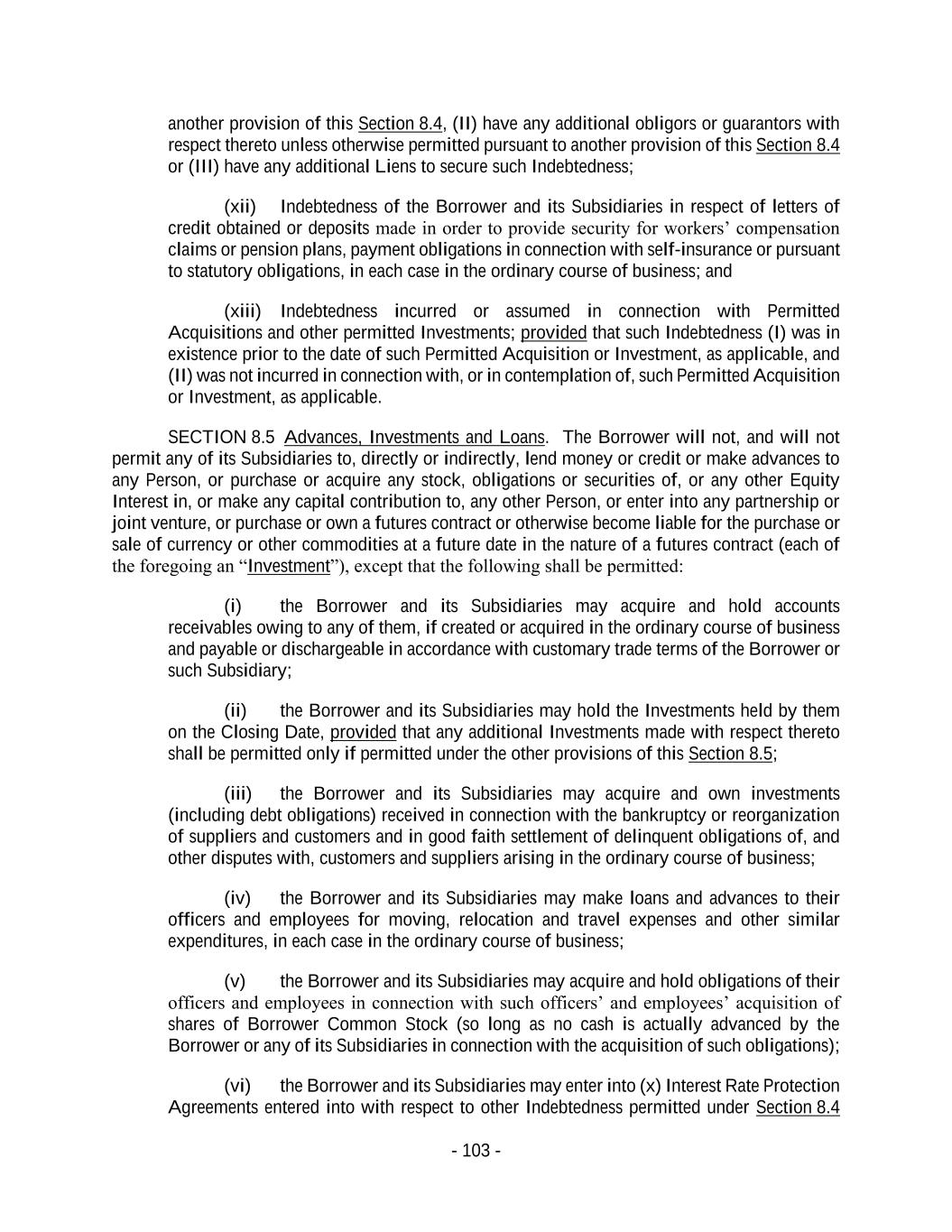 - 103 - another provision of this Section 8.4, (II) have any additional obligors or guarantors with respect thereto unless otherwise permitted pursuant to another provision of this Section 8.4 or (III) have any additional Liens to secure such Indebtedness; (xii) Indebtedness of the Borrower and its Subsidiaries in respect of letters of credit obtained or deposits made in order to provide security for workers’ compensation claims or pension plans, payment obligations in connection with self-insurance or pursuant to statutory obligations, in each case in the ordinary course of business; and (xiii) Indebtedness incurred or assumed in connection with Permitted Acquisitions and other permitted Investments; provided that such Indebtedness (I) was in existence prior to the date of such Permitted Acquisition or Investment, as applicable, and (II) was not incurred in connection with, or in contemplation of, such Permitted Acquisition or Investment, as applicable. SECTION 8.5 Advances, Investments and Loans. The Borrower will not, and will not permit any of its Subsidiaries to, directly or indirectly, lend money or credit or make advances to any Person, or purchase or acquire any stock, obligations or securities of, or any other Equity Interest in, or make any capital contribution to, any other Person, or enter into any partnership or joint venture, or purchase or own a futures contract or otherwise become liable for the purchase or sale of currency or other commodities at a future date in the nature of a futures contract (each of the foregoing an “Investment”), except that the following shall be permitted: (i) the Borrower and its Subsidiaries may acquire and hold accounts receivables owing to any of them, if created or acquired in the ordinary course of business and payable or dischargeable in accordance with customary trade terms of the Borrower or such Subsidiary; (ii) the Borrower and its Subsidiaries may hold the Investments held by them on the Closing Date, provided that any additional Investments made with respect thereto shall be permitted only if permitted under the other provisions of this Section 8.5; (iii) the Borrower and its Subsidiaries may acquire and own investments (including debt obligations) received in connection with the bankruptcy or reorganization of suppliers and customers and in good faith settlement of delinquent obligations of, and other disputes with, customers and suppliers arising in the ordinary course of business; (iv) the Borrower and its Subsidiaries may make loans and advances to their officers and employees for moving, relocation and travel expenses and other similar expenditures, in each case in the ordinary course of business; (v) the Borrower and its Subsidiaries may acquire and hold obligations of their officers and employees in connection with such officers’ and employees’ acquisition of shares of Borrower Common Stock (so long as no cash is actually advanced by the Borrower or any of its Subsidiaries in connection with the acquisition of such obligations); (vi) the Borrower and its Subsidiaries may enter into (x) Interest Rate Protection Agreements entered into with respect to other Indebtedness permitted under Section 8.4