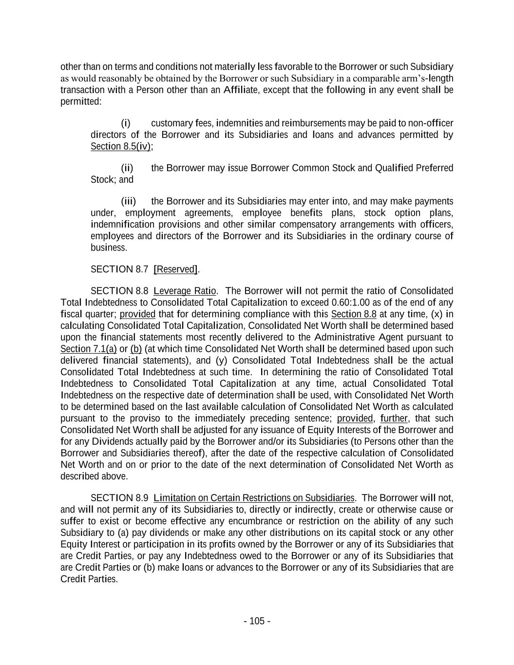- 105 - other than on terms and conditions not materially less favorable to the Borrower or such Subsidiary as would reasonably be obtained by the Borrower or such Subsidiary in a comparable arm’s-length transaction with a Person other than an Affiliate, except that the following in any event shall be permitted: (i) customary fees, indemnities and reimbursements may be paid to non-officer directors of the Borrower and its Subsidiaries and loans and advances permitted by Section 8.5(iv); (ii) the Borrower may issue Borrower Common Stock and Qualified Preferred Stock; and (iii) the Borrower and its Subsidiaries may enter into, and may make payments under, employment agreements, employee benefits plans, stock option plans, indemnification provisions and other similar compensatory arrangements with officers, employees and directors of the Borrower and its Subsidiaries in the ordinary course of business. SECTION 8.7 [Reserved]. SECTION 8.8 Leverage Ratio. The Borrower will not permit the ratio of Consolidated Total Indebtedness to Consolidated Total Capitalization to exceed 0.60:1.00 as of the end of any fiscal quarter; provided that for determining compliance with this Section 8.8 at any time, (x) in calculating Consolidated Total Capitalization, Consolidated Net Worth shall be determined based upon the financial statements most recently delivered to the Administrative Agent pursuant to Section 7.1(a) or (b) (at which time Consolidated Net Worth shall be determined based upon such delivered financial statements), and (y) Consolidated Total Indebtedness shall be the actual Consolidated Total Indebtedness at such time. In determining the ratio of Consolidated Total Indebtedness to Consolidated Total Capitalization at any time, actual Consolidated Total Indebtedness on the respective date of determination shall be used, with Consolidated Net Worth to be determined based on the last available calculation of Consolidated Net Worth as calculated pursuant to the proviso to the immediately preceding sentence; provided, further, that such Consolidated Net Worth shall be adjusted for any issuance of Equity Interests of the Borrower and for any Dividends actually paid by the Borrower and/or its Subsidiaries (to Persons other than the Borrower and Subsidiaries thereof), after the date of the respective calculation of Consolidated Net Worth and on or prior to the date of the next determination of Consolidated Net Worth as described above. SECTION 8.9 Limitation on Certain Restrictions on Subsidiaries. The Borrower will not, and will not permit any of its Subsidiaries to, directly or indirectly, create or otherwise cause or suffer to exist or become effective any encumbrance or restriction on the ability of any such Subsidiary to (a) pay dividends or make any other distributions on its capital stock or any other Equity Interest or participation in its profits owned by the Borrower or any of its Subsidiaries that are Credit Parties, or pay any Indebtedness owed to the Borrower or any of its Subsidiaries that are Credit Parties or (b) make loans or advances to the Borrower or any of its Subsidiaries that are Credit Parties.