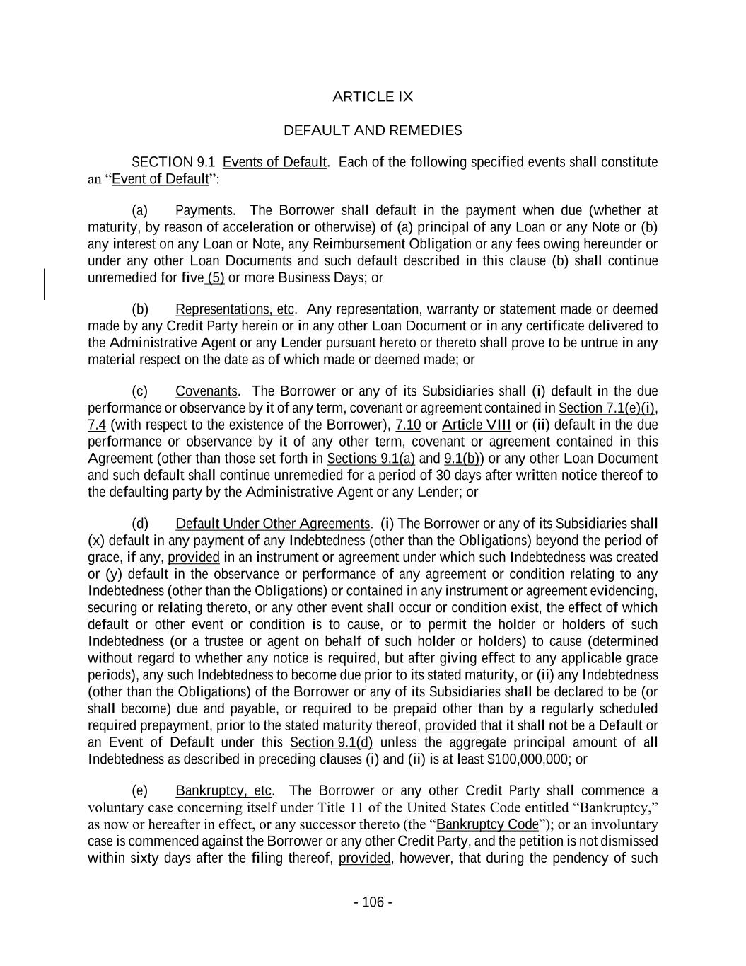 - 106 - ARTICLE IX DEFAULT AND REMEDIES SECTION 9.1 Events of Default. Each of the following specified events shall constitute an “Event of Default”: (a) Payments. The Borrower shall default in the payment when due (whether at maturity, by reason of acceleration or otherwise) of (a) principal of any Loan or any Note or (b) any interest on any Loan or Note, any Reimbursement Obligation or any fees owing hereunder or under any other Loan Documents and such default described in this clause (b) shall continue unremedied for five (5) or more Business Days; or (b) Representations, etc. Any representation, warranty or statement made or deemed made by any Credit Party herein or in any other Loan Document or in any certificate delivered to the Administrative Agent or any Lender pursuant hereto or thereto shall prove to be untrue in any material respect on the date as of which made or deemed made; or (c) Covenants. The Borrower or any of its Subsidiaries shall (i) default in the due performance or observance by it of any term, covenant or agreement contained in Section 7.1(e)(i), 7.4 (with respect to the existence of the Borrower), 7.10 or Article VIII or (ii) default in the due performance or observance by it of any other term, covenant or agreement contained in this Agreement (other than those set forth in Sections 9.1(a) and 9.1(b)) or any other Loan Document and such default shall continue unremedied for a period of 30 days after written notice thereof to the defaulting party by the Administrative Agent or any Lender; or (d) Default Under Other Agreements. (i) The Borrower or any of its Subsidiaries shall (x) default in any payment of any Indebtedness (other than the Obligations) beyond the period of grace, if any, provided in an instrument or agreement under which such Indebtedness was created or (y) default in the observance or performance of any agreement or condition relating to any Indebtedness (other than the Obligations) or contained in any instrument or agreement evidencing, securing or relating thereto, or any other event shall occur or condition exist, the effect of which default or other event or condition is to cause, or to permit the holder or holders of such Indebtedness (or a trustee or agent on behalf of such holder or holders) to cause (determined without regard to whether any notice is required, but after giving effect to any applicable grace periods), any such Indebtedness to become due prior to its stated maturity, or (ii) any Indebtedness (other than the Obligations) of the Borrower or any of its Subsidiaries shall be declared to be (or shall become) due and payable, or required to be prepaid other than by a regularly scheduled required prepayment, prior to the stated maturity thereof, provided that it shall not be a Default or an Event of Default under this Section 9.1(d) unless the aggregate principal amount of all Indebtedness as described in preceding clauses (i) and (ii) is at least $100,000,000; or (e) Bankruptcy, etc. The Borrower or any other Credit Party shall commence a voluntary case concerning itself under Title 11 of the United States Code entitled “Bankruptcy,” as now or hereafter in effect, or any successor thereto (the “Bankruptcy Code”); or an involuntary case is commenced against the Borrower or any other Credit Party, and the petition is not dismissed within sixty days after the filing thereof, provided, however, that during the pendency of such