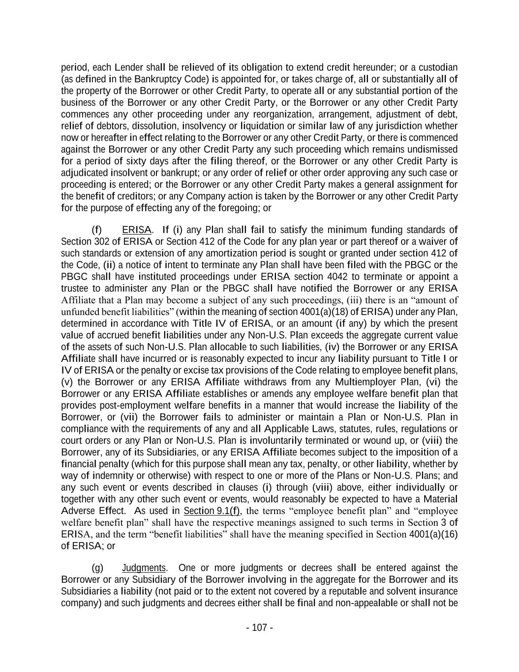 - 107 - period, each Lender shall be relieved of its obligation to extend credit hereunder; or a custodian (as defined in the Bankruptcy Code) is appointed for, or takes charge of, all or substantially all of the property of the Borrower or other Credit Party, to operate all or any substantial portion of the business of the Borrower or any other Credit Party, or the Borrower or any other Credit Party commences any other proceeding under any reorganization, arrangement, adjustment of debt, relief of debtors, dissolution, insolvency or liquidation or similar law of any jurisdiction whether now or hereafter in effect relating to the Borrower or any other Credit Party, or there is commenced against the Borrower or any other Credit Party any such proceeding which remains undismissed for a period of sixty days after the filing thereof, or the Borrower or any other Credit Party is adjudicated insolvent or bankrupt; or any order of relief or other order approving any such case or proceeding is entered; or the Borrower or any other Credit Party makes a general assignment for the benefit of creditors; or any Company action is taken by the Borrower or any other Credit Party for the purpose of effecting any of the foregoing; or (f) ERISA. If (i) any Plan shall fail to satisfy the minimum funding standards of Section 302 of ERISA or Section 412 of the Code for any plan year or part thereof or a waiver of such standards or extension of any amortization period is sought or granted under section 412 of the Code, (ii) a notice of intent to terminate any Plan shall have been filed with the PBGC or the PBGC shall have instituted proceedings under ERISA section 4042 to terminate or appoint a trustee to administer any Plan or the PBGC shall have notified the Borrower or any ERISA Affiliate that a Plan may become a subject of any such proceedings, (iii) there is an “amount of unfunded benefit liabilities” (within the meaning of section 4001(a)(18) of ERISA) under any Plan, determined in accordance with Title IV of ERISA, or an amount (if any) by which the present value of accrued benefit liabilities under any Non-U.S. Plan exceeds the aggregate current value of the assets of such Non-U.S. Plan allocable to such liabilities, (iv) the Borrower or any ERISA Affiliate shall have incurred or is reasonably expected to incur any liability pursuant to Title I or IV of ERISA or the penalty or excise tax provisions of the Code relating to employee benefit plans, (v) the Borrower or any ERISA Affiliate withdraws from any Multiemployer Plan, (vi) the Borrower or any ERISA Affiliate establishes or amends any employee welfare benefit plan that provides post-employment welfare benefits in a manner that would increase the liability of the Borrower, or (vii) the Borrower fails to administer or maintain a Plan or Non-U.S. Plan in compliance with the requirements of any and all Applicable Laws, statutes, rules, regulations or court orders or any Plan or Non-U.S. Plan is involuntarily terminated or wound up, or (viii) the Borrower, any of its Subsidiaries, or any ERISA Affiliate becomes subject to the imposition of a financial penalty (which for this purpose shall mean any tax, penalty, or other liability, whether by way of indemnity or otherwise) with respect to one or more of the Plans or Non-U.S. Plans; and any such event or events described in clauses (i) through (viii) above, either individually or together with any other such event or events, would reasonably be expected to have a Material Adverse Effect. As used in Section 9.1(f), the terms “employee benefit plan” and “employee welfare benefit plan” shall have the respective meanings assigned to such terms in Section 3 of ERISA, and the term “benefit liabilities” shall have the meaning specified in Section 4001(a)(16) of ERISA; or (g) Judgments. One or more judgments or decrees shall be entered against the Borrower or any Subsidiary of the Borrower involving in the aggregate for the Borrower and its Subsidiaries a liability (not paid or to the extent not covered by a reputable and solvent insurance company) and such judgments and decrees either shall be final and non-appealable or shall not be