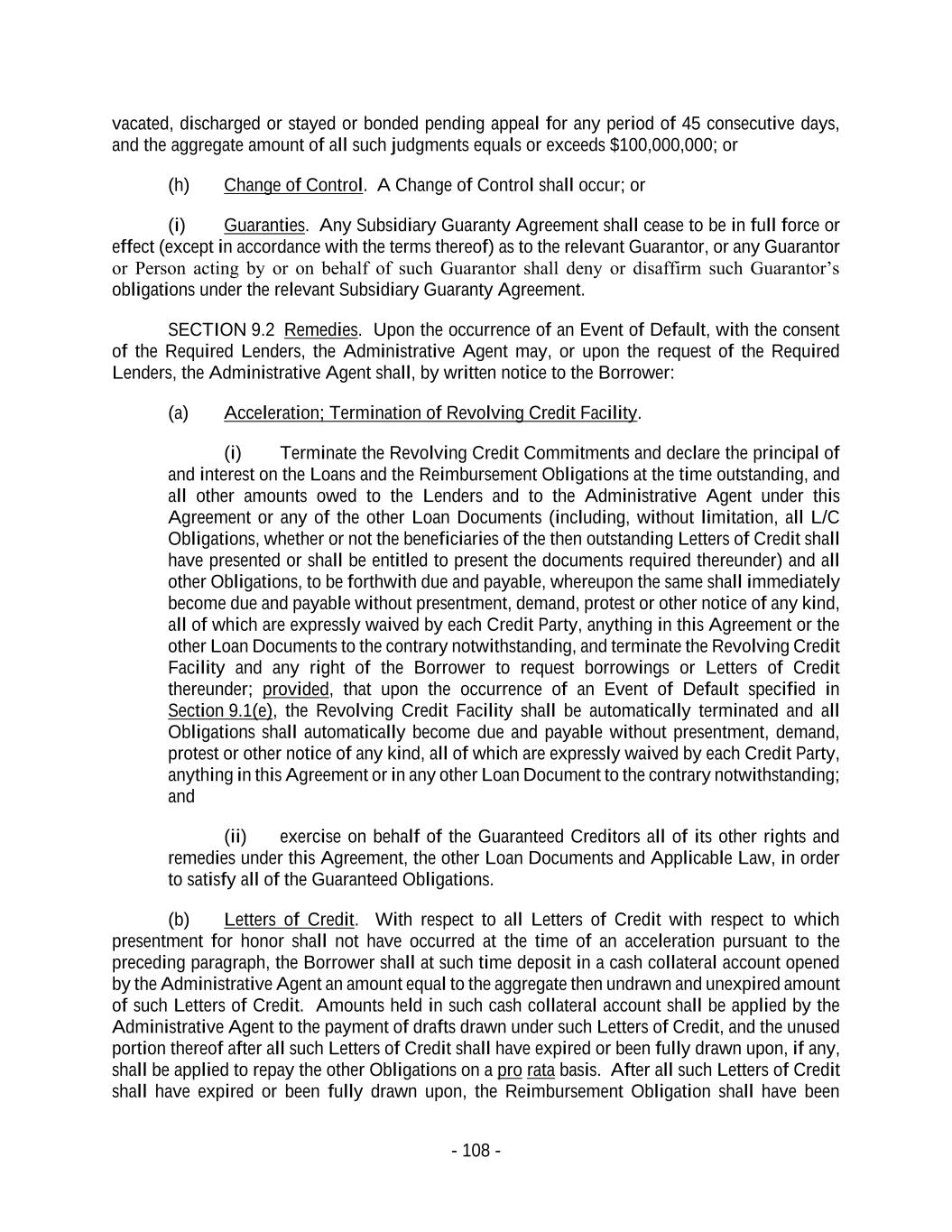 - 108 - vacated, discharged or stayed or bonded pending appeal for any period of 45 consecutive days, and the aggregate amount of all such judgments equals or exceeds $100,000,000; or (h) Change of Control. A Change of Control shall occur; or (i) Guaranties. Any Subsidiary Guaranty Agreement shall cease to be in full force or effect (except in accordance with the terms thereof) as to the relevant Guarantor, or any Guarantor or Person acting by or on behalf of such Guarantor shall deny or disaffirm such Guarantor’s obligations under the relevant Subsidiary Guaranty Agreement. SECTION 9.2 Remedies. Upon the occurrence of an Event of Default, with the consent of the Required Lenders, the Administrative Agent may, or upon the request of the Required Lenders, the Administrative Agent shall, by written notice to the Borrower: (a) Acceleration; Termination of Revolving Credit Facility. (i) Terminate the Revolving Credit Commitments and declare the principal of and interest on the Loans and the Reimbursement Obligations at the time outstanding, and all other amounts owed to the Lenders and to the Administrative Agent under this Agreement or any of the other Loan Documents (including, without limitation, all L/C Obligations, whether or not the beneficiaries of the then outstanding Letters of Credit shall have presented or shall be entitled to present the documents required thereunder) and all other Obligations, to be forthwith due and payable, whereupon the same shall immediately become due and payable without presentment, demand, protest or other notice of any kind, all of which are expressly waived by each Credit Party, anything in this Agreement or the other Loan Documents to the contrary notwithstanding, and terminate the Revolving Credit Facility and any right of the Borrower to request borrowings or Letters of Credit thereunder; provided, that upon the occurrence of an Event of Default specified in Section 9.1(e), the Revolving Credit Facility shall be automatically terminated and all Obligations shall automatically become due and payable without presentment, demand, protest or other notice of any kind, all of which are expressly waived by each Credit Party, anything in this Agreement or in any other Loan Document to the contrary notwithstanding; and (ii) exercise on behalf of the Guaranteed Creditors all of its other rights and remedies under this Agreement, the other Loan Documents and Applicable Law, in order to satisfy all of the Guaranteed Obligations. (b) Letters of Credit. With respect to all Letters of Credit with respect to which presentment for honor shall not have occurred at the time of an acceleration pursuant to the preceding paragraph, the Borrower shall at such time deposit in a cash collateral account opened by the Administrative Agent an amount equal to the aggregate then undrawn and unexpired amount of such Letters of Credit. Amounts held in such cash collateral account shall be applied by the Administrative Agent to the payment of drafts drawn under such Letters of Credit, and the unused portion thereof after all such Letters of Credit shall have expired or been fully drawn upon, if any, shall be applied to repay the other Obligations on a pro rata basis. After all such Letters of Credit shall have expired or been fully drawn upon, the Reimbursement Obligation shall have been