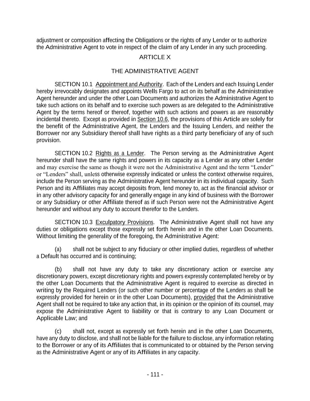 - 111 - adjustment or composition affecting the Obligations or the rights of any Lender or to authorize the Administrative Agent to vote in respect of the claim of any Lender in any such proceeding. ARTICLE X THE ADMINISTRATIVE AGENT SECTION 10.1 Appointment and Authority. Each of the Lenders and each Issuing Lender hereby irrevocably designates and appoints Wells Fargo to act on its behalf as the Administrative Agent hereunder and under the other Loan Documents and authorizes the Administrative Agent to take such actions on its behalf and to exercise such powers as are delegated to the Administrative Agent by the terms hereof or thereof, together with such actions and powers as are reasonably incidental thereto. Except as provided in Section 10.6, the provisions of this Article are solely for the benefit of the Administrative Agent, the Lenders and the Issuing Lenders, and neither the Borrower nor any Subsidiary thereof shall have rights as a third party beneficiary of any of such provision. SECTION 10.2 Rights as a Lender. The Person serving as the Administrative Agent hereunder shall have the same rights and powers in its capacity as a Lender as any other Lender and may exercise the same as though it were not the Administrative Agent and the term “Lender” or “Lenders” shall, unless otherwise expressly indicated or unless the context otherwise requires, include the Person serving as the Administrative Agent hereunder in its individual capacity. Such Person and its Affiliates may accept deposits from, lend money to, act as the financial advisor or in any other advisory capacity for and generally engage in any kind of business with the Borrower or any Subsidiary or other Affiliate thereof as if such Person were not the Administrative Agent hereunder and without any duty to account therefor to the Lenders. SECTION 10.3 Exculpatory Provisions. The Administrative Agent shall not have any duties or obligations except those expressly set forth herein and in the other Loan Documents. Without limiting the generality of the foregoing, the Administrative Agent: (a) shall not be subject to any fiduciary or other implied duties, regardless of whether a Default has occurred and is continuing; (b) shall not have any duty to take any discretionary action or exercise any discretionary powers, except discretionary rights and powers expressly contemplated hereby or by the other Loan Documents that the Administrative Agent is required to exercise as directed in writing by the Required Lenders (or such other number or percentage of the Lenders as shall be expressly provided for herein or in the other Loan Documents), provided that the Administrative Agent shall not be required to take any action that, in its opinion or the opinion of its counsel, may expose the Administrative Agent to liability or that is contrary to any Loan Document or Applicable Law; and (c) shall not, except as expressly set forth herein and in the other Loan Documents, have any duty to disclose, and shall not be liable for the failure to disclose, any information relating to the Borrower or any of its Affiliates that is communicated to or obtained by the Person serving as the Administrative Agent or any of its Affiliates in any capacity.