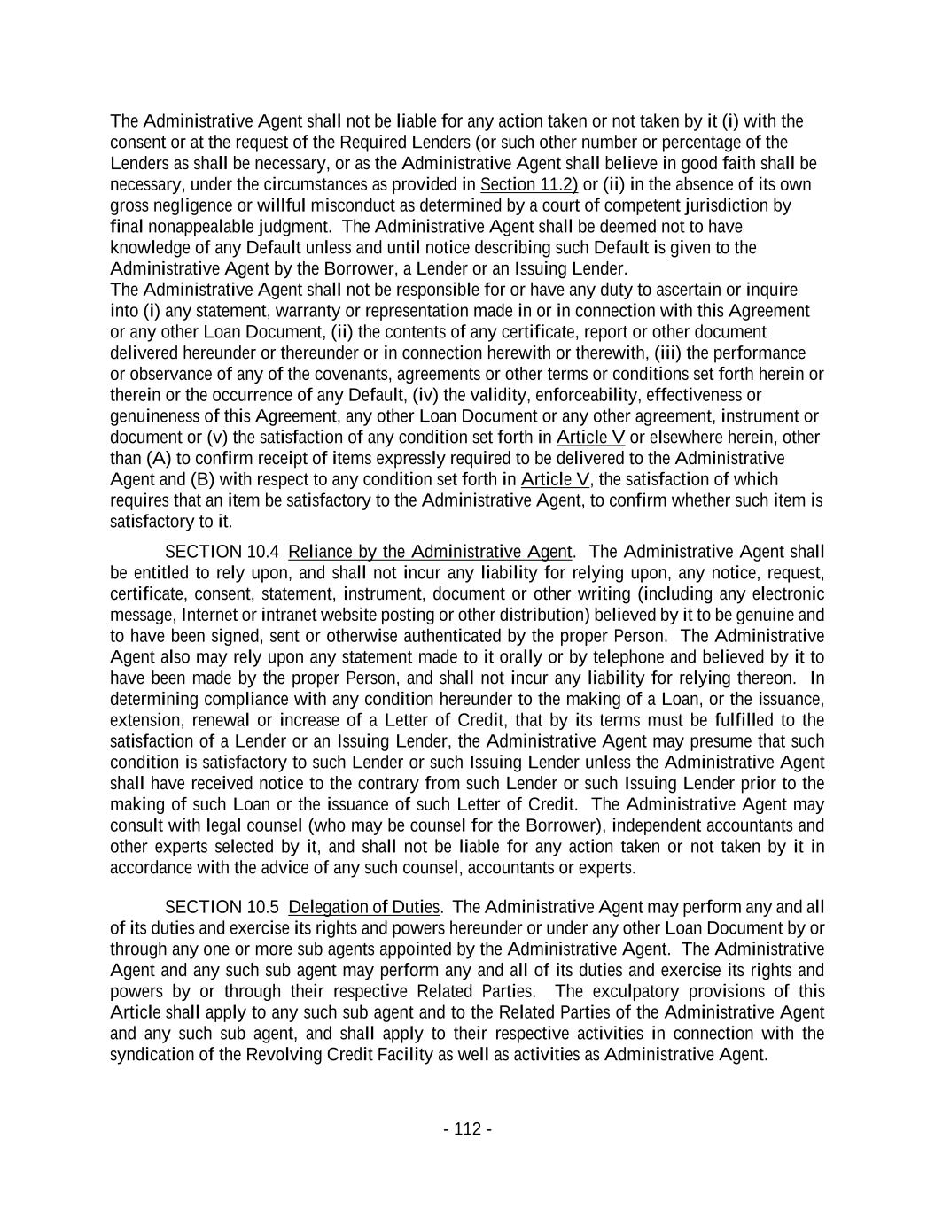 - 112 - The Administrative Agent shall not be liable for any action taken or not taken by it (i) with the consent or at the request of the Required Lenders (or such other number or percentage of the Lenders as shall be necessary, or as the Administrative Agent shall believe in good faith shall be necessary, under the circumstances as provided in Section 11.2) or (ii) in the absence of its own gross negligence or willful misconduct as determined by a court of competent jurisdiction by final nonappealable judgment. The Administrative Agent shall be deemed not to have knowledge of any Default unless and until notice describing such Default is given to the Administrative Agent by the Borrower, a Lender or an Issuing Lender. The Administrative Agent shall not be responsible for or have any duty to ascertain or inquire into (i) any statement, warranty or representation made in or in connection with this Agreement or any other Loan Document, (ii) the contents of any certificate, report or other document delivered hereunder or thereunder or in connection herewith or therewith, (iii) the performance or observance of any of the covenants, agreements or other terms or conditions set forth herein or therein or the occurrence of any Default, (iv) the validity, enforceability, effectiveness or genuineness of this Agreement, any other Loan Document or any other agreement, instrument or document or (v) the satisfaction of any condition set forth in Article V or elsewhere herein, other than (A) to confirm receipt of items expressly required to be delivered to the Administrative Agent and (B) with respect to any condition set forth in Article V, the satisfaction of which requires that an item be satisfactory to the Administrative Agent, to confirm whether such item is satisfactory to it. SECTION 10.4 Reliance by the Administrative Agent. The Administrative Agent shall be entitled to rely upon, and shall not incur any liability for relying upon, any notice, request, certificate, consent, statement, instrument, document or other writing (including any electronic message, Internet or intranet website posting or other distribution) believed by it to be genuine and to have been signed, sent or otherwise authenticated by the proper Person. The Administrative Agent also may rely upon any statement made to it orally or by telephone and believed by it to have been made by the proper Person, and shall not incur any liability for relying thereon. In determining compliance with any condition hereunder to the making of a Loan, or the issuance, extension, renewal or increase of a Letter of Credit, that by its terms must be fulfilled to the satisfaction of a Lender or an Issuing Lender, the Administrative Agent may presume that such condition is satisfactory to such Lender or such Issuing Lender unless the Administrative Agent shall have received notice to the contrary from such Lender or such Issuing Lender prior to the making of such Loan or the issuance of such Letter of Credit. The Administrative Agent may consult with legal counsel (who may be counsel for the Borrower), independent accountants and other experts selected by it, and shall not be liable for any action taken or not taken by it in accordance with the advice of any such counsel, accountants or experts. SECTION 10.5 Delegation of Duties. The Administrative Agent may perform any and all of its duties and exercise its rights and powers hereunder or under any other Loan Document by or through any one or more sub agents appointed by the Administrative Agent. The Administrative Agent and any such sub agent may perform any and all of its duties and exercise its rights and powers by or through their respective Related Parties. The exculpatory provisions of this Article shall apply to any such sub agent and to the Related Parties of the Administrative Agent and any such sub agent, and shall apply to their respective activities in connection with the syndication of the Revolving Credit Facility as well as activities as Administrative Agent.