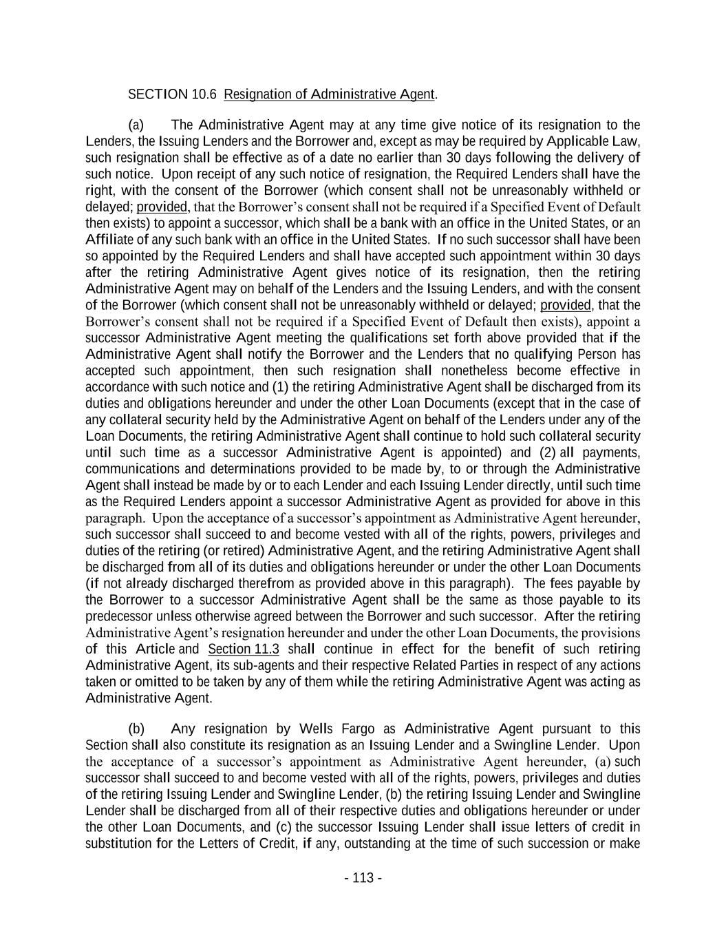 - 113 - SECTION 10.6 Resignation of Administrative Agent. (a) The Administrative Agent may at any time give notice of its resignation to the Lenders, the Issuing Lenders and the Borrower and, except as may be required by Applicable Law, such resignation shall be effective as of a date no earlier than 30 days following the delivery of such notice. Upon receipt of any such notice of resignation, the Required Lenders shall have the right, with the consent of the Borrower (which consent shall not be unreasonably withheld or delayed; provided, that the Borrower’s consent shall not be required if a Specified Event of Default then exists) to appoint a successor, which shall be a bank with an office in the United States, or an Affiliate of any such bank with an office in the United States. If no such successor shall have been so appointed by the Required Lenders and shall have accepted such appointment within 30 days after the retiring Administrative Agent gives notice of its resignation, then the retiring Administrative Agent may on behalf of the Lenders and the Issuing Lenders, and with the consent of the Borrower (which consent shall not be unreasonably withheld or delayed; provided, that the Borrower’s consent shall not be required if a Specified Event of Default then exists), appoint a successor Administrative Agent meeting the qualifications set forth above provided that if the Administrative Agent shall notify the Borrower and the Lenders that no qualifying Person has accepted such appointment, then such resignation shall nonetheless become effective in accordance with such notice and (1) the retiring Administrative Agent shall be discharged from its duties and obligations hereunder and under the other Loan Documents (except that in the case of any collateral security held by the Administrative Agent on behalf of the Lenders under any of the Loan Documents, the retiring Administrative Agent shall continue to hold such collateral security until such time as a successor Administrative Agent is appointed) and (2) all payments, communications and determinations provided to be made by, to or through the Administrative Agent shall instead be made by or to each Lender and each Issuing Lender directly, until such time as the Required Lenders appoint a successor Administrative Agent as provided for above in this paragraph. Upon the acceptance of a successor’s appointment as Administrative Agent hereunder, such successor shall succeed to and become vested with all of the rights, powers, privileges and duties of the retiring (or retired) Administrative Agent, and the retiring Administrative Agent shall be discharged from all of its duties and obligations hereunder or under the other Loan Documents (if not already discharged therefrom as provided above in this paragraph). The fees payable by the Borrower to a successor Administrative Agent shall be the same as those payable to its predecessor unless otherwise agreed between the Borrower and such successor. After the retiring Administrative Agent’s resignation hereunder and under the other Loan Documents, the provisions of this Article and Section 11.3 shall continue in effect for the benefit of such retiring Administrative Agent, its sub-agents and their respective Related Parties in respect of any actions taken or omitted to be taken by any of them while the retiring Administrative Agent was acting as Administrative Agent. (b) Any resignation by Wells Fargo as Administrative Agent pursuant to this Section shall also constitute its resignation as an Issuing Lender and a Swingline Lender. Upon the acceptance of a successor’s appointment as Administrative Agent hereunder, (a) such successor shall succeed to and become vested with all of the rights, powers, privileges and duties of the retiring Issuing Lender and Swingline Lender, (b) the retiring Issuing Lender and Swingline Lender shall be discharged from all of their respective duties and obligations hereunder or under the other Loan Documents, and (c) the successor Issuing Lender shall issue letters of credit in substitution for the Letters of Credit, if any, outstanding at the time of such succession or make