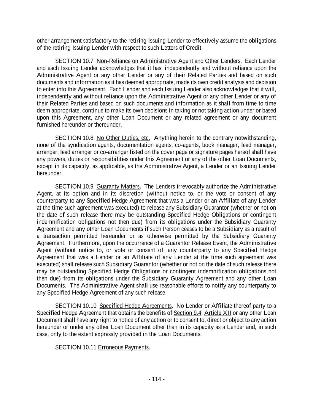 - 114 - other arrangement satisfactory to the retiring Issuing Lender to effectively assume the obligations of the retiring Issuing Lender with respect to such Letters of Credit. SECTION 10.7 Non-Reliance on Administrative Agent and Other Lenders. Each Lender and each Issuing Lender acknowledges that it has, independently and without reliance upon the Administrative Agent or any other Lender or any of their Related Parties and based on such documents and information as it has deemed appropriate, made its own credit analysis and decision to enter into this Agreement. Each Lender and each Issuing Lender also acknowledges that it will, independently and without reliance upon the Administrative Agent or any other Lender or any of their Related Parties and based on such documents and information as it shall from time to time deem appropriate, continue to make its own decisions in taking or not taking action under or based upon this Agreement, any other Loan Document or any related agreement or any document furnished hereunder or thereunder. SECTION 10.8 No Other Duties, etc. Anything herein to the contrary notwithstanding, none of the syndication agents, documentation agents, co-agents, book manager, lead manager, arranger, lead arranger or co-arranger listed on the cover page or signature pages hereof shall have any powers, duties or responsibilities under this Agreement or any of the other Loan Documents, except in its capacity, as applicable, as the Administrative Agent, a Lender or an Issuing Lender hereunder. SECTION 10.9 Guaranty Matters. The Lenders irrevocably authorize the Administrative Agent, at its option and in its discretion (without notice to, or the vote or consent of any counterparty to any Specified Hedge Agreement that was a Lender or an Affiliate of any Lender at the time such agreement was executed) to release any Subsidiary Guarantor (whether or not on the date of such release there may be outstanding Specified Hedge Obligations or contingent indemnification obligations not then due) from its obligations under the Subsidiary Guaranty Agreement and any other Loan Documents if such Person ceases to be a Subsidiary as a result of a transaction permitted hereunder or as otherwise permitted by the Subsidiary Guaranty Agreement. Furthermore, upon the occurrence of a Guarantor Release Event, the Administrative Agent (without notice to, or vote or consent of, any counterparty to any Specified Hedge Agreement that was a Lender or an Affiliate of any Lender at the time such agreement was executed) shall release such Subsidiary Guarantor (whether or not on the date of such release there may be outstanding Specified Hedge Obligations or contingent indemnification obligations not then due) from its obligations under the Subsidiary Guaranty Agreement and any other Loan Documents. The Administrative Agent shall use reasonable efforts to notify any counterparty to any Specified Hedge Agreement of any such release. SECTION 10.10 Specified Hedge Agreements. No Lender or Affiliate thereof party to a Specified Hedge Agreement that obtains the benefits of Section 9.4, Article XII or any other Loan Document shall have any right to notice of any action or to consent to, direct or object to any action hereunder or under any other Loan Document other than in its capacity as a Lender and, in such case, only to the extent expressly provided in the Loan Documents. SECTION 10.11 Erroneous Payments.