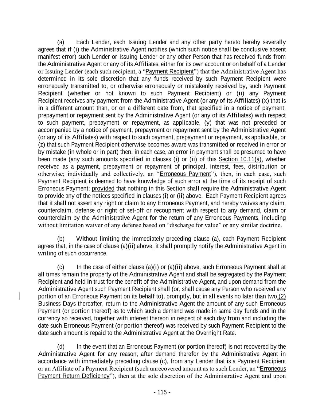 - 115 - (a) Each Lender, each Issuing Lender and any other party hereto hereby severally agrees that if (i) the Administrative Agent notifies (which such notice shall be conclusive absent manifest error) such Lender or Issuing Lender or any other Person that has received funds from the Administrative Agent or any of its Affiliates, either for its own account or on behalf of a Lender or Issuing Lender (each such recipient, a “Payment Recipient”) that the Administrative Agent has determined in its sole discretion that any funds received by such Payment Recipient were erroneously transmitted to, or otherwise erroneously or mistakenly received by, such Payment Recipient (whether or not known to such Payment Recipient) or (ii) any Payment Recipient receives any payment from the Administrative Agent (or any of its Affiliates) (x) that is in a different amount than, or on a different date from, that specified in a notice of payment, prepayment or repayment sent by the Administrative Agent (or any of its Affiliates) with respect to such payment, prepayment or repayment, as applicable, (y) that was not preceded or accompanied by a notice of payment, prepayment or repayment sent by the Administrative Agent (or any of its Affiliates) with respect to such payment, prepayment or repayment, as applicable, or (z) that such Payment Recipient otherwise becomes aware was transmitted or received in error or by mistake (in whole or in part) then, in each case, an error in payment shall be presumed to have been made (any such amounts specified in clauses (i) or (ii) of this Section 10.11(a), whether received as a payment, prepayment or repayment of principal, interest, fees, distribution or otherwise; individually and collectively, an “Erroneous Payment”), then, in each case, such Payment Recipient is deemed to have knowledge of such error at the time of its receipt of such Erroneous Payment; provided that nothing in this Section shall require the Administrative Agent to provide any of the notices specified in clauses (i) or (ii) above. Each Payment Recipient agrees that it shall not assert any right or claim to any Erroneous Payment, and hereby waives any claim, counterclaim, defense or right of set-off or recoupment with respect to any demand, claim or counterclaim by the Administrative Agent for the return of any Erroneous Payments, including without limitation waiver of any defense based on “discharge for value” or any similar doctrine. (b) Without limiting the immediately preceding clause (a), each Payment Recipient agrees that, in the case of clause (a)(ii) above, it shall promptly notify the Administrative Agent in writing of such occurrence. (c) In the case of either clause (a)(i) or (a)(ii) above, such Erroneous Payment shall at all times remain the property of the Administrative Agent and shall be segregated by the Payment Recipient and held in trust for the benefit of the Administrative Agent, and upon demand from the Administrative Agent such Payment Recipient shall (or, shall cause any Person who received any portion of an Erroneous Payment on its behalf to), promptly, but in all events no later than two (2) Business Days thereafter, return to the Administrative Agent the amount of any such Erroneous Payment (or portion thereof) as to which such a demand was made in same day funds and in the currency so received, together with interest thereon in respect of each day from and including the date such Erroneous Payment (or portion thereof) was received by such Payment Recipient to the date such amount is repaid to the Administrative Agent at the Overnight Rate. (d) In the event that an Erroneous Payment (or portion thereof) is not recovered by the Administrative Agent for any reason, after demand therefor by the Administrative Agent in accordance with immediately preceding clause (c), from any Lender that is a Payment Recipient or an Affiliate of a Payment Recipient (such unrecovered amount as to such Lender, an “Erroneous Payment Return Deficiency”), then at the sole discretion of the Administrative Agent and upon