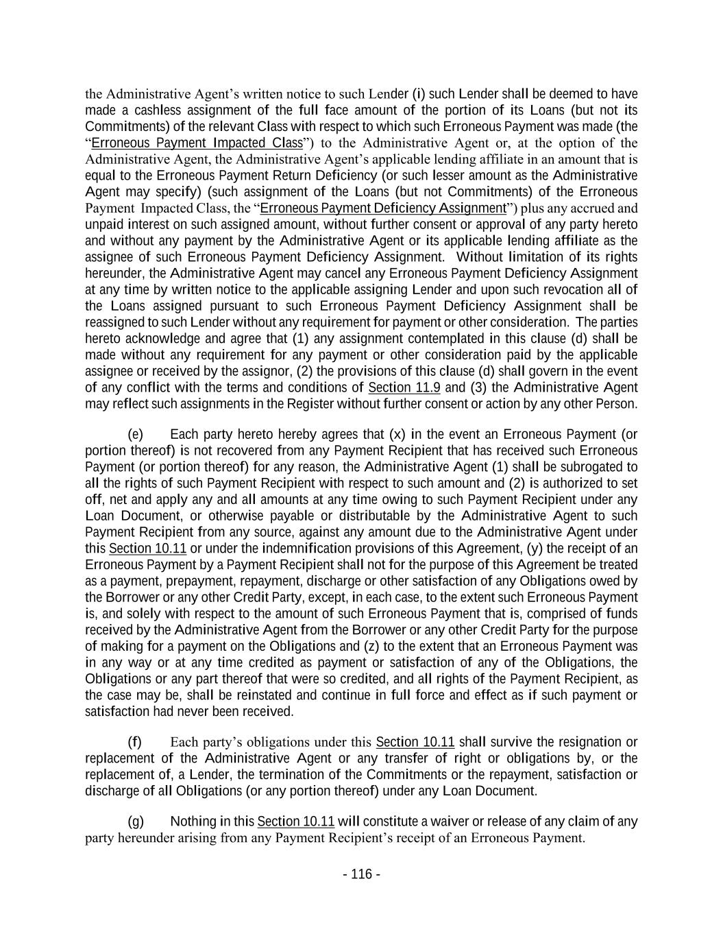 - 116 - the Administrative Agent’s written notice to such Lender (i) such Lender shall be deemed to have made a cashless assignment of the full face amount of the portion of its Loans (but not its Commitments) of the relevant Class with respect to which such Erroneous Payment was made (the “Erroneous Payment Impacted Class”) to the Administrative Agent or, at the option of the Administrative Agent, the Administrative Agent’s applicable lending affiliate in an amount that is equal to the Erroneous Payment Return Deficiency (or such lesser amount as the Administrative Agent may specify) (such assignment of the Loans (but not Commitments) of the Erroneous Payment Impacted Class, the “Erroneous Payment Deficiency Assignment”) plus any accrued and unpaid interest on such assigned amount, without further consent or approval of any party hereto and without any payment by the Administrative Agent or its applicable lending affiliate as the assignee of such Erroneous Payment Deficiency Assignment. Without limitation of its rights hereunder, the Administrative Agent may cancel any Erroneous Payment Deficiency Assignment at any time by written notice to the applicable assigning Lender and upon such revocation all of the Loans assigned pursuant to such Erroneous Payment Deficiency Assignment shall be reassigned to such Lender without any requirement for payment or other consideration. The parties hereto acknowledge and agree that (1) any assignment contemplated in this clause (d) shall be made without any requirement for any payment or other consideration paid by the applicable assignee or received by the assignor, (2) the provisions of this clause (d) shall govern in the event of any conflict with the terms and conditions of Section 11.9 and (3) the Administrative Agent may reflect such assignments in the Register without further consent or action by any other Person. (e) Each party hereto hereby agrees that (x) in the event an Erroneous Payment (or portion thereof) is not recovered from any Payment Recipient that has received such Erroneous Payment (or portion thereof) for any reason, the Administrative Agent (1) shall be subrogated to all the rights of such Payment Recipient with respect to such amount and (2) is authorized to set off, net and apply any and all amounts at any time owing to such Payment Recipient under any Loan Document, or otherwise payable or distributable by the Administrative Agent to such Payment Recipient from any source, against any amount due to the Administrative Agent under this Section 10.11 or under the indemnification provisions of this Agreement, (y) the receipt of an Erroneous Payment by a Payment Recipient shall not for the purpose of this Agreement be treated as a payment, prepayment, repayment, discharge or other satisfaction of any Obligations owed by the Borrower or any other Credit Party, except, in each case, to the extent such Erroneous Payment is, and solely with respect to the amount of such Erroneous Payment that is, comprised of funds received by the Administrative Agent from the Borrower or any other Credit Party for the purpose of making for a payment on the Obligations and (z) to the extent that an Erroneous Payment was in any way or at any time credited as payment or satisfaction of any of the Obligations, the Obligations or any part thereof that were so credited, and all rights of the Payment Recipient, as the case may be, shall be reinstated and continue in full force and effect as if such payment or satisfaction had never been received. (f) Each party’s obligations under this Section 10.11 shall survive the resignation or replacement of the Administrative Agent or any transfer of right or obligations by, or the replacement of, a Lender, the termination of the Commitments or the repayment, satisfaction or discharge of all Obligations (or any portion thereof) under any Loan Document. (g) Nothing in this Section 10.11 will constitute a waiver or release of any claim of any party hereunder arising from any Payment Recipient’s receipt of an Erroneous Payment.