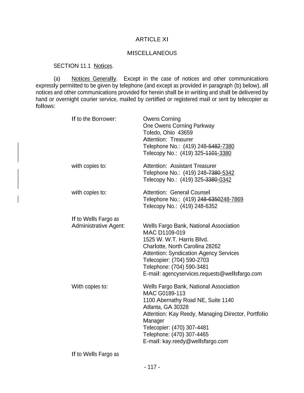 - 117 - ARTICLE XI MISCELLANEOUS SECTION 11.1 Notices. (a) Notices Generally. Except in the case of notices and other communications expressly permitted to be given by telephone (and except as provided in paragraph (b) below), all notices and other communications provided for herein shall be in writing and shall be delivered by hand or overnight courier service, mailed by certified or registered mail or sent by telecopier as follows: If to the Borrower: Owens Corning One Owens Corning Parkway Toledo, Ohio 43659 Attention: Treasurer Telephone No.: (419) 248-5482-7380 Telecopy No.: (419) 325-1101-3380 with copies to: Attention: Assistant Treasurer Telephone No.: (419) 248-7380-5342 Telecopy No.: (419) 325-3380-0342 with copies to: Attention: General Counsel Telephone No.: (419) 248-6350248-7869 Telecopy No.: (419) 248-6352 If to Wells Fargo as Administrative Agent: Wells Fargo Bank, National Association MAC D1109-019 1525 W. W.T. Harris Blvd. Charlotte, North Carolina 28262 Attention: Syndication Agency Services Telecopier: (704) 590-2703 Telephone: (704) 590-3481 E-mail: agencyservices.requests@wellsfargo.com With copies to: Wells Fargo Bank, National Association MAC G0189-113 1100 Abernathy Road NE, Suite 1140 Atlanta, GA 30328 Attention: Kay Reedy, Managing Director, Portfolio Manager Telecopier: (470) 307-4481 Telephone: (470) 307-4465 E-mail: kay.reedy@wellsfargo.com If to Wells Fargo as