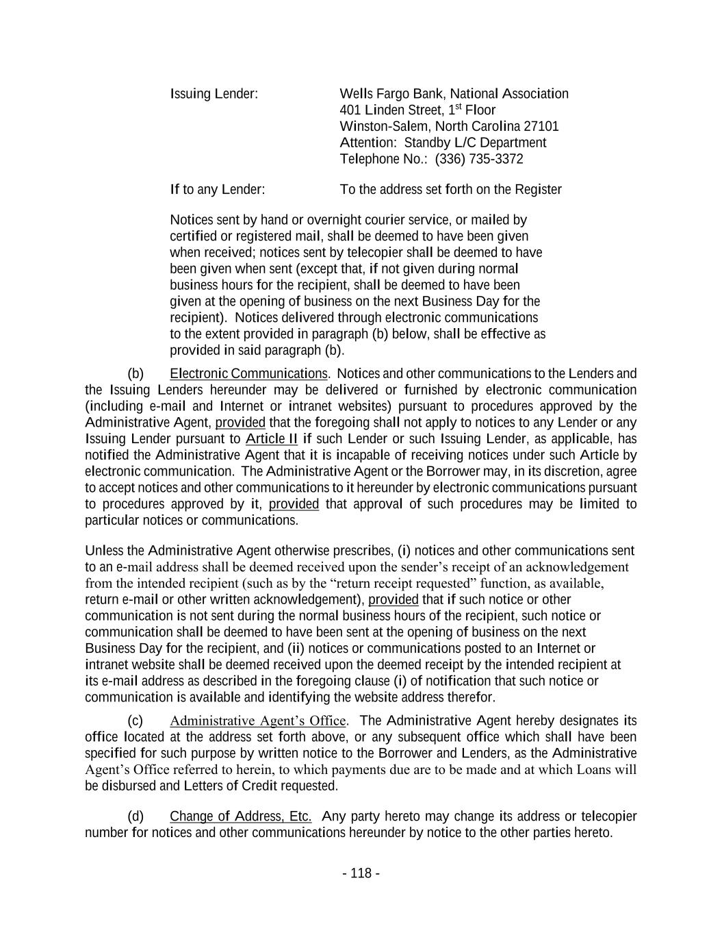 - 118 - Issuing Lender: Wells Fargo Bank, National Association 401 Linden Street, 1st Floor Winston-Salem, North Carolina 27101 Attention: Standby L/C Department Telephone No.: (336) 735-3372 If to any Lender: To the address set forth on the Register Notices sent by hand or overnight courier service, or mailed by certified or registered mail, shall be deemed to have been given when received; notices sent by telecopier shall be deemed to have been given when sent (except that, if not given during normal business hours for the recipient, shall be deemed to have been given at the opening of business on the next Business Day for the recipient). Notices delivered through electronic communications to the extent provided in paragraph (b) below, shall be effective as provided in said paragraph (b). (b) Electronic Communications. Notices and other communications to the Lenders and the Issuing Lenders hereunder may be delivered or furnished by electronic communication (including e-mail and Internet or intranet websites) pursuant to procedures approved by the Administrative Agent, provided that the foregoing shall not apply to notices to any Lender or any Issuing Lender pursuant to Article II if such Lender or such Issuing Lender, as applicable, has notified the Administrative Agent that it is incapable of receiving notices under such Article by electronic communication. The Administrative Agent or the Borrower may, in its discretion, agree to accept notices and other communications to it hereunder by electronic communications pursuant to procedures approved by it, provided that approval of such procedures may be limited to particular notices or communications. Unless the Administrative Agent otherwise prescribes, (i) notices and other communications sent to an e-mail address shall be deemed received upon the sender’s receipt of an acknowledgement from the intended recipient (such as by the “return receipt requested” function, as available, return e-mail or other written acknowledgement), provided that if such notice or other communication is not sent during the normal business hours of the recipient, such notice or communication shall be deemed to have been sent at the opening of business on the next Business Day for the recipient, and (ii) notices or communications posted to an Internet or intranet website shall be deemed received upon the deemed receipt by the intended recipient at its e-mail address as described in the foregoing clause (i) of notification that such notice or communication is available and identifying the website address therefor. (c) Administrative Agent’s Office. The Administrative Agent hereby designates its office located at the address set forth above, or any subsequent office which shall have been specified for such purpose by written notice to the Borrower and Lenders, as the Administrative Agent’s Office referred to herein, to which payments due are to be made and at which Loans will be disbursed and Letters of Credit requested. (d) Change of Address, Etc. Any party hereto may change its address or telecopier number for notices and other communications hereunder by notice to the other parties hereto.