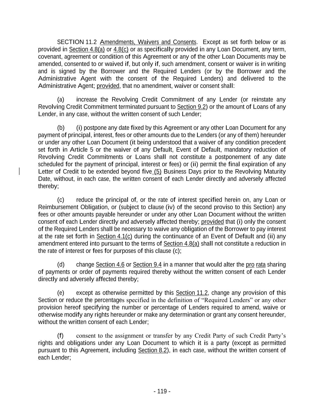 - 119 - SECTION 11.2 Amendments, Waivers and Consents. Except as set forth below or as provided in Section 4.8(a) or 4.8(c) or as specifically provided in any Loan Document, any term, covenant, agreement or condition of this Agreement or any of the other Loan Documents may be amended, consented to or waived if, but only if, such amendment, consent or waiver is in writing and is signed by the Borrower and the Required Lenders (or by the Borrower and the Administrative Agent with the consent of the Required Lenders) and delivered to the Administrative Agent; provided, that no amendment, waiver or consent shall: (a) increase the Revolving Credit Commitment of any Lender (or reinstate any Revolving Credit Commitment terminated pursuant to Section 9.2) or the amount of Loans of any Lender, in any case, without the written consent of such Lender; (b) (i) postpone any date fixed by this Agreement or any other Loan Document for any payment of principal, interest, fees or other amounts due to the Lenders (or any of them) hereunder or under any other Loan Document (it being understood that a waiver of any condition precedent set forth in Article 5 or the waiver of any Default, Event of Default, mandatory reduction of Revolving Credit Commitments or Loans shall not constitute a postponement of any date scheduled for the payment of principal, interest or fees) or (ii) permit the final expiration of any Letter of Credit to be extended beyond five (5) Business Days prior to the Revolving Maturity Date, without, in each case, the written consent of each Lender directly and adversely affected thereby; (c) reduce the principal of, or the rate of interest specified herein on, any Loan or Reimbursement Obligation, or (subject to clause (iv) of the second proviso to this Section) any fees or other amounts payable hereunder or under any other Loan Document without the written consent of each Lender directly and adversely affected thereby; provided that (i) only the consent of the Required Lenders shall be necessary to waive any obligation of the Borrower to pay interest at the rate set forth in Section 4.1(c) during the continuance of an Event of Default and (ii) any amendment entered into pursuant to the terms of Section 4.8(a) shall not constitute a reduction in the rate of interest or fees for purposes of this clause (c); (d) change Section 4.6 or Section 9.4 in a manner that would alter the pro rata sharing of payments or order of payments required thereby without the written consent of each Lender directly and adversely affected thereby; (e) except as otherwise permitted by this Section 11.2, change any provision of this Section or reduce the percentages specified in the definition of “Required Lenders” or any other provision hereof specifying the number or percentage of Lenders required to amend, waive or otherwise modify any rights hereunder or make any determination or grant any consent hereunder, without the written consent of each Lender; (f) consent to the assignment or transfer by any Credit Party of such Credit Party’s rights and obligations under any Loan Document to which it is a party (except as permitted pursuant to this Agreement, including Section 8.2), in each case, without the written consent of each Lender;