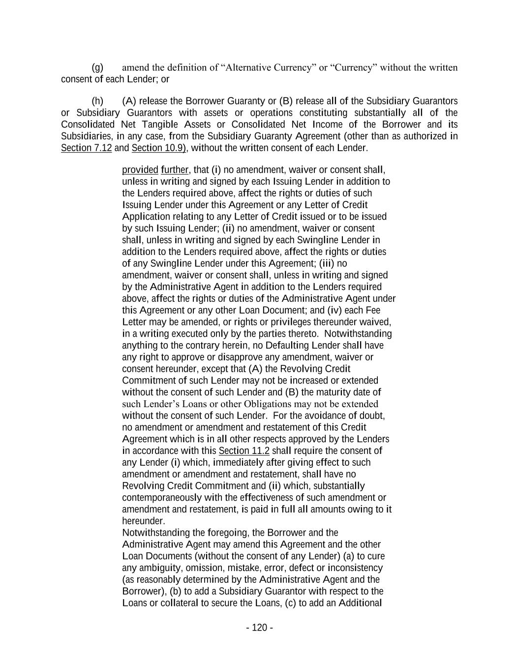 - 120 - (g) amend the definition of “Alternative Currency” or “Currency” without the written consent of each Lender; or (h) (A) release the Borrower Guaranty or (B) release all of the Subsidiary Guarantors or Subsidiary Guarantors with assets or operations constituting substantially all of the Consolidated Net Tangible Assets or Consolidated Net Income of the Borrower and its Subsidiaries, in any case, from the Subsidiary Guaranty Agreement (other than as authorized in Section 7.12 and Section 10.9), without the written consent of each Lender. provided further, that (i) no amendment, waiver or consent shall, unless in writing and signed by each Issuing Lender in addition to the Lenders required above, affect the rights or duties of such Issuing Lender under this Agreement or any Letter of Credit Application relating to any Letter of Credit issued or to be issued by such Issuing Lender; (ii) no amendment, waiver or consent shall, unless in writing and signed by each Swingline Lender in addition to the Lenders required above, affect the rights or duties of any Swingline Lender under this Agreement; (iii) no amendment, waiver or consent shall, unless in writing and signed by the Administrative Agent in addition to the Lenders required above, affect the rights or duties of the Administrative Agent under this Agreement or any other Loan Document; and (iv) each Fee Letter may be amended, or rights or privileges thereunder waived, in a writing executed only by the parties thereto. Notwithstanding anything to the contrary herein, no Defaulting Lender shall have any right to approve or disapprove any amendment, waiver or consent hereunder, except that (A) the Revolving Credit Commitment of such Lender may not be increased or extended without the consent of such Lender and (B) the maturity date of such Lender’s Loans or other Obligations may not be extended without the consent of such Lender. For the avoidance of doubt, no amendment or amendment and restatement of this Credit Agreement which is in all other respects approved by the Lenders in accordance with this Section 11.2 shall require the consent of any Lender (i) which, immediately after giving effect to such amendment or amendment and restatement, shall have no Revolving Credit Commitment and (ii) which, substantially contemporaneously with the effectiveness of such amendment or amendment and restatement, is paid in full all amounts owing to it hereunder. Notwithstanding the foregoing, the Borrower and the Administrative Agent may amend this Agreement and the other Loan Documents (without the consent of any Lender) (a) to cure any ambiguity, omission, mistake, error, defect or inconsistency (as reasonably determined by the Administrative Agent and the Borrower), (b) to add a Subsidiary Guarantor with respect to the Loans or collateral to secure the Loans, (c) to add an Additional