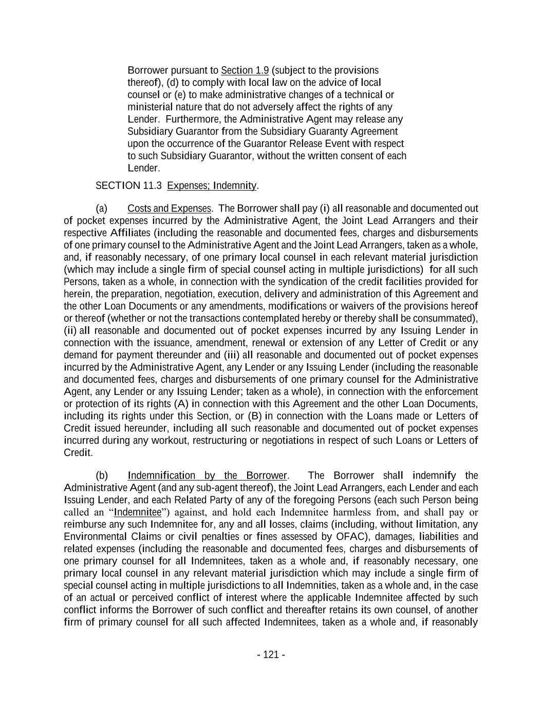 - 121 - Borrower pursuant to Section 1.9 (subject to the provisions thereof), (d) to comply with local law on the advice of local counsel or (e) to make administrative changes of a technical or ministerial nature that do not adversely affect the rights of any Lender. Furthermore, the Administrative Agent may release any Subsidiary Guarantor from the Subsidiary Guaranty Agreement upon the occurrence of the Guarantor Release Event with respect to such Subsidiary Guarantor, without the written consent of each Lender. SECTION 11.3 Expenses; Indemnity. (a) Costs and Expenses. The Borrower shall pay (i) all reasonable and documented out of pocket expenses incurred by the Administrative Agent, the Joint Lead Arrangers and their respective Affiliates (including the reasonable and documented fees, charges and disbursements of one primary counsel to the Administrative Agent and the Joint Lead Arrangers, taken as a whole, and, if reasonably necessary, of one primary local counsel in each relevant material jurisdiction (which may include a single firm of special counsel acting in multiple jurisdictions) for all such Persons, taken as a whole, in connection with the syndication of the credit facilities provided for herein, the preparation, negotiation, execution, delivery and administration of this Agreement and the other Loan Documents or any amendments, modifications or waivers of the provisions hereof or thereof (whether or not the transactions contemplated hereby or thereby shall be consummated), (ii) all reasonable and documented out of pocket expenses incurred by any Issuing Lender in connection with the issuance, amendment, renewal or extension of any Letter of Credit or any demand for payment thereunder and (iii) all reasonable and documented out of pocket expenses incurred by the Administrative Agent, any Lender or any Issuing Lender (including the reasonable and documented fees, charges and disbursements of one primary counsel for the Administrative Agent, any Lender or any Issuing Lender; taken as a whole), in connection with the enforcement or protection of its rights (A) in connection with this Agreement and the other Loan Documents, including its rights under this Section, or (B) in connection with the Loans made or Letters of Credit issued hereunder, including all such reasonable and documented out of pocket expenses incurred during any workout, restructuring or negotiations in respect of such Loans or Letters of Credit. (b) Indemnification by the Borrower. The Borrower shall indemnify the Administrative Agent (and any sub-agent thereof), the Joint Lead Arrangers, each Lender and each Issuing Lender, and each Related Party of any of the foregoing Persons (each such Person being called an “Indemnitee”) against, and hold each Indemnitee harmless from, and shall pay or reimburse any such Indemnitee for, any and all losses, claims (including, without limitation, any Environmental Claims or civil penalties or fines assessed by OFAC), damages, liabilities and related expenses (including the reasonable and documented fees, charges and disbursements of one primary counsel for all Indemnitees, taken as a whole and, if reasonably necessary, one primary local counsel in any relevant material jurisdiction which may include a single firm of special counsel acting in multiple jurisdictions to all Indemnities, taken as a whole and, in the case of an actual or perceived conflict of interest where the applicable Indemnitee affected by such conflict informs the Borrower of such conflict and thereafter retains its own counsel, of another firm of primary counsel for all such affected Indemnitees, taken as a whole and, if reasonably