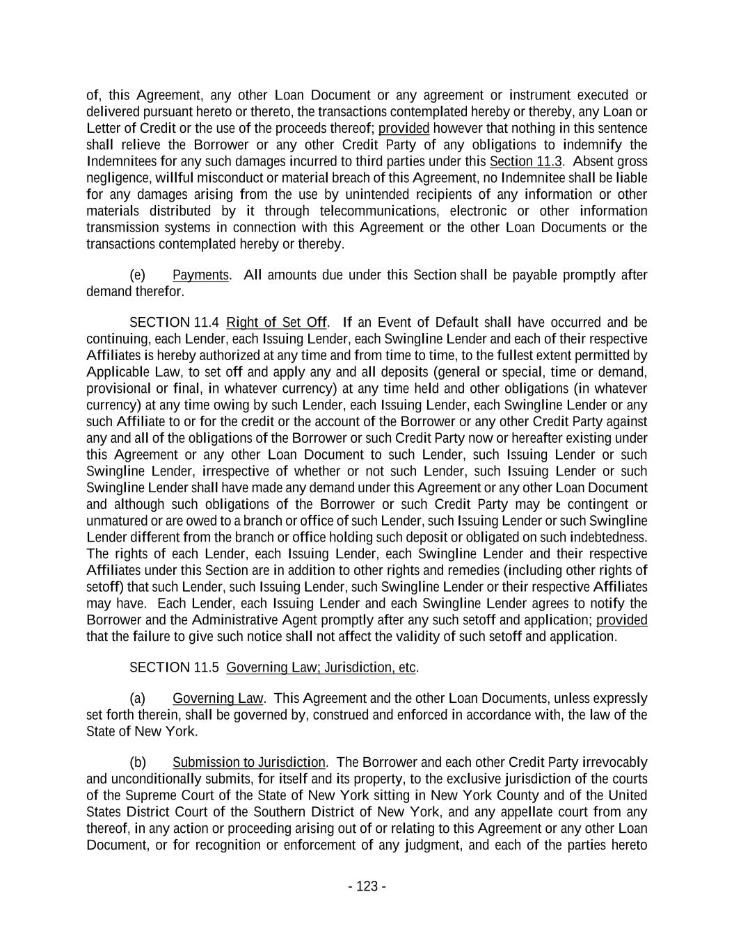 - 123 - of, this Agreement, any other Loan Document or any agreement or instrument executed or delivered pursuant hereto or thereto, the transactions contemplated hereby or thereby, any Loan or Letter of Credit or the use of the proceeds thereof; provided however that nothing in this sentence shall relieve the Borrower or any other Credit Party of any obligations to indemnify the Indemnitees for any such damages incurred to third parties under this Section 11.3. Absent gross negligence, willful misconduct or material breach of this Agreement, no Indemnitee shall be liable for any damages arising from the use by unintended recipients of any information or other materials distributed by it through telecommunications, electronic or other information transmission systems in connection with this Agreement or the other Loan Documents or the transactions contemplated hereby or thereby. (e) Payments. All amounts due under this Section shall be payable promptly after demand therefor. SECTION 11.4 Right of Set Off. If an Event of Default shall have occurred and be continuing, each Lender, each Issuing Lender, each Swingline Lender and each of their respective Affiliates is hereby authorized at any time and from time to time, to the fullest extent permitted by Applicable Law, to set off and apply any and all deposits (general or special, time or demand, provisional or final, in whatever currency) at any time held and other obligations (in whatever currency) at any time owing by such Lender, each Issuing Lender, each Swingline Lender or any such Affiliate to or for the credit or the account of the Borrower or any other Credit Party against any and all of the obligations of the Borrower or such Credit Party now or hereafter existing under this Agreement or any other Loan Document to such Lender, such Issuing Lender or such Swingline Lender, irrespective of whether or not such Lender, such Issuing Lender or such Swingline Lender shall have made any demand under this Agreement or any other Loan Document and although such obligations of the Borrower or such Credit Party may be contingent or unmatured or are owed to a branch or office of such Lender, such Issuing Lender or such Swingline Lender different from the branch or office holding such deposit or obligated on such indebtedness. The rights of each Lender, each Issuing Lender, each Swingline Lender and their respective Affiliates under this Section are in addition to other rights and remedies (including other rights of setoff) that such Lender, such Issuing Lender, such Swingline Lender or their respective Affiliates may have. Each Lender, each Issuing Lender and each Swingline Lender agrees to notify the Borrower and the Administrative Agent promptly after any such setoff and application; provided that the failure to give such notice shall not affect the validity of such setoff and application. SECTION 11.5 Governing Law; Jurisdiction, etc. (a) Governing Law. This Agreement and the other Loan Documents, unless expressly set forth therein, shall be governed by, construed and enforced in accordance with, the law of the State of New York. (b) Submission to Jurisdiction. The Borrower and each other Credit Party irrevocably and unconditionally submits, for itself and its property, to the exclusive jurisdiction of the courts of the Supreme Court of the State of New York sitting in New York County and of the United States District Court of the Southern District of New York, and any appellate court from any thereof, in any action or proceeding arising out of or relating to this Agreement or any other Loan Document, or for recognition or enforcement of any judgment, and each of the parties hereto