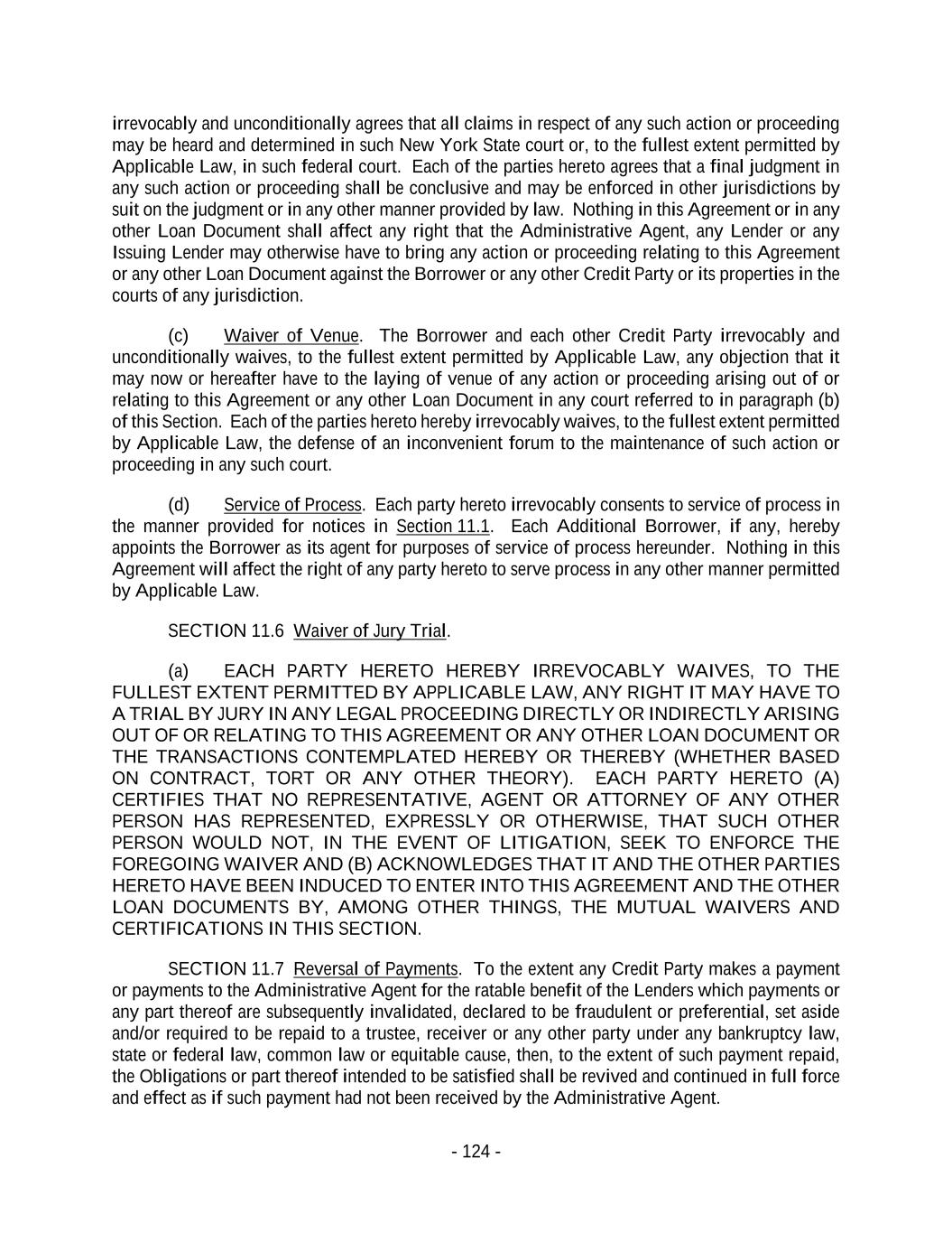 - 124 - irrevocably and unconditionally agrees that all claims in respect of any such action or proceeding may be heard and determined in such New York State court or, to the fullest extent permitted by Applicable Law, in such federal court. Each of the parties hereto agrees that a final judgment in any such action or proceeding shall be conclusive and may be enforced in other jurisdictions by suit on the judgment or in any other manner provided by law. Nothing in this Agreement or in any other Loan Document shall affect any right that the Administrative Agent, any Lender or any Issuing Lender may otherwise have to bring any action or proceeding relating to this Agreement or any other Loan Document against the Borrower or any other Credit Party or its properties in the courts of any jurisdiction. (c) Waiver of Venue. The Borrower and each other Credit Party irrevocably and unconditionally waives, to the fullest extent permitted by Applicable Law, any objection that it may now or hereafter have to the laying of venue of any action or proceeding arising out of or relating to this Agreement or any other Loan Document in any court referred to in paragraph (b) of this Section. Each of the parties hereto hereby irrevocably waives, to the fullest extent permitted by Applicable Law, the defense of an inconvenient forum to the maintenance of such action or proceeding in any such court. (d) Service of Process. Each party hereto irrevocably consents to service of process in the manner provided for notices in Section 11.1. Each Additional Borrower, if any, hereby appoints the Borrower as its agent for purposes of service of process hereunder. Nothing in this Agreement will affect the right of any party hereto to serve process in any other manner permitted by Applicable Law. SECTION 11.6 Waiver of Jury Trial. (a) EACH PARTY HERETO HEREBY IRREVOCABLY WAIVES, TO THE FULLEST EXTENT PERMITTED BY APPLICABLE LAW, ANY RIGHT IT MAY HAVE TO A TRIAL BY JURY IN ANY LEGAL PROCEEDING DIRECTLY OR INDIRECTLY ARISING OUT OF OR RELATING TO THIS AGREEMENT OR ANY OTHER LOAN DOCUMENT OR THE TRANSACTIONS CONTEMPLATED HEREBY OR THEREBY (WHETHER BASED ON CONTRACT, TORT OR ANY OTHER THEORY). EACH PARTY HERETO (A) CERTIFIES THAT NO REPRESENTATIVE, AGENT OR ATTORNEY OF ANY OTHER PERSON HAS REPRESENTED, EXPRESSLY OR OTHERWISE, THAT SUCH OTHER PERSON WOULD NOT, IN THE EVENT OF LITIGATION, SEEK TO ENFORCE THE FOREGOING WAIVER AND (B) ACKNOWLEDGES THAT IT AND THE OTHER PARTIES HERETO HAVE BEEN INDUCED TO ENTER INTO THIS AGREEMENT AND THE OTHER LOAN DOCUMENTS BY, AMONG OTHER THINGS, THE MUTUAL WAIVERS AND CERTIFICATIONS IN THIS SECTION. SECTION 11.7 Reversal of Payments. To the extent any Credit Party makes a payment or payments to the Administrative Agent for the ratable benefit of the Lenders which payments or any part thereof are subsequently invalidated, declared to be fraudulent or preferential, set aside and/or required to be repaid to a trustee, receiver or any other party under any bankruptcy law, state or federal law, common law or equitable cause, then, to the extent of such payment repaid, the Obligations or part thereof intended to be satisfied shall be revived and continued in full force and effect as if such payment had not been received by the Administrative Agent.