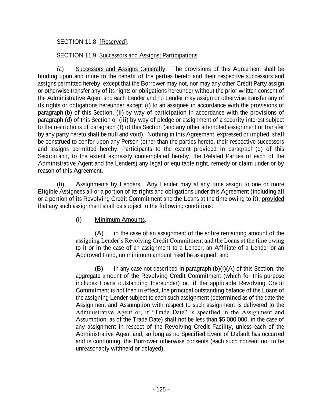 - 125 - SECTION 11.8 [Reserved]. SECTION 11.9 Successors and Assigns; Participations. (a) Successors and Assigns Generally. The provisions of this Agreement shall be binding upon and inure to the benefit of the parties hereto and their respective successors and assigns permitted hereby, except that the Borrower may not, nor may any other Credit Party assign or otherwise transfer any of its rights or obligations hereunder without the prior written consent of the Administrative Agent and each Lender and no Lender may assign or otherwise transfer any of its rights or obligations hereunder except (i) to an assignee in accordance with the provisions of paragraph (b) of this Section, (ii) by way of participation in accordance with the provisions of paragraph (d) of this Section or (iii) by way of pledge or assignment of a security interest subject to the restrictions of paragraph (f) of this Section (and any other attempted assignment or transfer by any party hereto shall be null and void). Nothing in this Agreement, expressed or implied, shall be construed to confer upon any Person (other than the parties hereto, their respective successors and assigns permitted hereby, Participants to the extent provided in paragraph (d) of this Section and, to the extent expressly contemplated hereby, the Related Parties of each of the Administrative Agent and the Lenders) any legal or equitable right, remedy or claim under or by reason of this Agreement. (b) Assignments by Lenders. Any Lender may at any time assign to one or more Eligible Assignees all or a portion of its rights and obligations under this Agreement (including all or a portion of its Revolving Credit Commitment and the Loans at the time owing to it); provided that any such assignment shall be subject to the following conditions: (i) Minimum Amounts. (A) in the case of an assignment of the entire remaining amount of the assigning Lender’s Revolving Credit Commitment and the Loans at the time owing to it or in the case of an assignment to a Lender, an Affiliate of a Lender or an Approved Fund, no minimum amount need be assigned; and (B) in any case not described in paragraph (b)(i)(A) of this Section, the aggregate amount of the Revolving Credit Commitment (which for this purpose includes Loans outstanding thereunder) or, if the applicable Revolving Credit Commitment is not then in effect, the principal outstanding balance of the Loans of the assigning Lender subject to each such assignment (determined as of the date the Assignment and Assumption with respect to such assignment is delivered to the Administrative Agent or, if “Trade Date” is specified in the Assignment and Assumption, as of the Trade Date) shall not be less than $5,000,000, in the case of any assignment in respect of the Revolving Credit Facility, unless each of the Administrative Agent and, so long as no Specified Event of Default has occurred and is continuing, the Borrower otherwise consents (each such consent not to be unreasonably withheld or delayed).