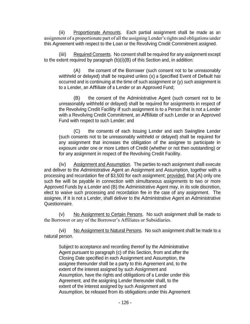 - 126 - (ii) Proportionate Amounts. Each partial assignment shall be made as an assignment of a proportionate part of all the assigning Lender’s rights and obligations under this Agreement with respect to the Loan or the Revolving Credit Commitment assigned. (iii) Required Consents. No consent shall be required for any assignment except to the extent required by paragraph (b)(i)(B) of this Section and, in addition: (A) the consent of the Borrower (such consent not to be unreasonably withheld or delayed) shall be required unless (x) a Specified Event of Default has occurred and is continuing at the time of such assignment or (y) such assignment is to a Lender, an Affiliate of a Lender or an Approved Fund; (B) the consent of the Administrative Agent (such consent not to be unreasonably withheld or delayed) shall be required for assignments in respect of the Revolving Credit Facility if such assignment is to a Person that is not a Lender with a Revolving Credit Commitment, an Affiliate of such Lender or an Approved Fund with respect to such Lender; and (C) the consents of each Issuing Lender and each Swingline Lender (such consents not to be unreasonably withheld or delayed) shall be required for any assignment that increases the obligation of the assignee to participate in exposure under one or more Letters of Credit (whether or not then outstanding) or for any assignment in respect of the Revolving Credit Facility. (iv) Assignment and Assumption. The parties to each assignment shall execute and deliver to the Administrative Agent an Assignment and Assumption, together with a processing and recordation fee of $3,500 for each assignment; provided, that (A) only one such fee will be payable in connection with simultaneous assignments to two or more Approved Funds by a Lender and (B) the Administrative Agent may, in its sole discretion, elect to waive such processing and recordation fee in the case of any assignment. The assignee, if it is not a Lender, shall deliver to the Administrative Agent an Administrative Questionnaire. (v) No Assignment to Certain Persons. No such assignment shall be made to the Borrower or any of the Borrower’s Affiliates or Subsidiaries. (vi) No Assignment to Natural Persons. No such assignment shall be made to a natural person. Subject to acceptance and recording thereof by the Administrative Agent pursuant to paragraph (c) of this Section, from and after the Closing Date specified in each Assignment and Assumption, the assignee thereunder shall be a party to this Agreement and, to the extent of the interest assigned by such Assignment and Assumption, have the rights and obligations of a Lender under this Agreement, and the assigning Lender thereunder shall, to the extent of the interest assigned by such Assignment and Assumption, be released from its obligations under this Agreement