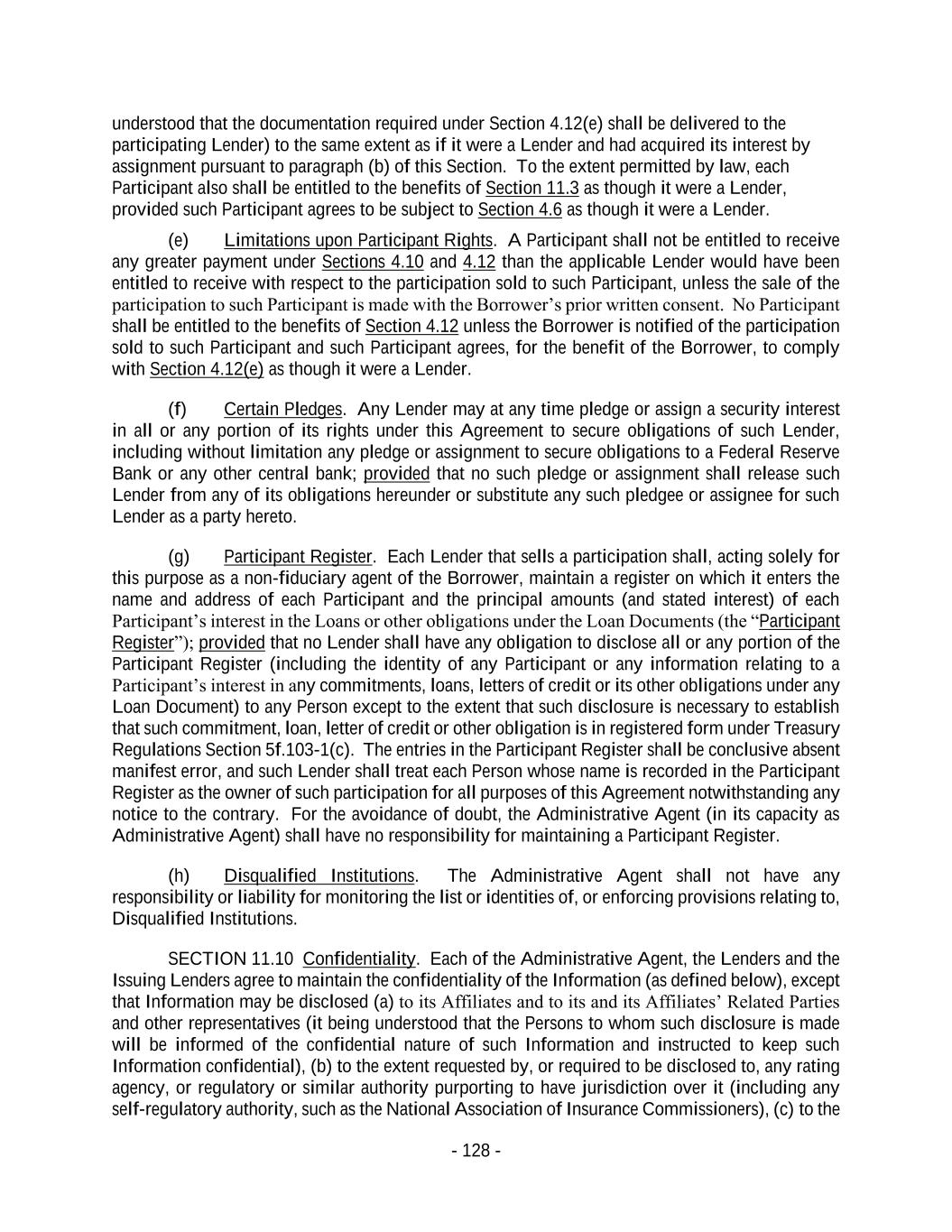 - 128 - understood that the documentation required under Section 4.12(e) shall be delivered to the participating Lender) to the same extent as if it were a Lender and had acquired its interest by assignment pursuant to paragraph (b) of this Section. To the extent permitted by law, each Participant also shall be entitled to the benefits of Section 11.3 as though it were a Lender, provided such Participant agrees to be subject to Section 4.6 as though it were a Lender. (e) Limitations upon Participant Rights. A Participant shall not be entitled to receive any greater payment under Sections 4.10 and 4.12 than the applicable Lender would have been entitled to receive with respect to the participation sold to such Participant, unless the sale of the participation to such Participant is made with the Borrower’s prior written consent. No Participant shall be entitled to the benefits of Section 4.12 unless the Borrower is notified of the participation sold to such Participant and such Participant agrees, for the benefit of the Borrower, to comply with Section 4.12(e) as though it were a Lender. (f) Certain Pledges. Any Lender may at any time pledge or assign a security interest in all or any portion of its rights under this Agreement to secure obligations of such Lender, including without limitation any pledge or assignment to secure obligations to a Federal Reserve Bank or any other central bank; provided that no such pledge or assignment shall release such Lender from any of its obligations hereunder or substitute any such pledgee or assignee for such Lender as a party hereto. (g) Participant Register. Each Lender that sells a participation shall, acting solely for this purpose as a non-fiduciary agent of the Borrower, maintain a register on which it enters the name and address of each Participant and the principal amounts (and stated interest) of each Participant’s interest in the Loans or other obligations under the Loan Documents (the “Participant Register”); provided that no Lender shall have any obligation to disclose all or any portion of the Participant Register (including the identity of any Participant or any information relating to a Participant’s interest in any commitments, loans, letters of credit or its other obligations under any Loan Document) to any Person except to the extent that such disclosure is necessary to establish that such commitment, loan, letter of credit or other obligation is in registered form under Treasury Regulations Section 5f.103-1(c). The entries in the Participant Register shall be conclusive absent manifest error, and such Lender shall treat each Person whose name is recorded in the Participant Register as the owner of such participation for all purposes of this Agreement notwithstanding any notice to the contrary. For the avoidance of doubt, the Administrative Agent (in its capacity as Administrative Agent) shall have no responsibility for maintaining a Participant Register. (h) Disqualified Institutions. The Administrative Agent shall not have any responsibility or liability for monitoring the list or identities of, or enforcing provisions relating to, Disqualified Institutions. SECTION 11.10 Confidentiality. Each of the Administrative Agent, the Lenders and the Issuing Lenders agree to maintain the confidentiality of the Information (as defined below), except that Information may be disclosed (a) to its Affiliates and to its and its Affiliates’ Related Parties and other representatives (it being understood that the Persons to whom such disclosure is made will be informed of the confidential nature of such Information and instructed to keep such Information confidential), (b) to the extent requested by, or required to be disclosed to, any rating agency, or regulatory or similar authority purporting to have jurisdiction over it (including any self-regulatory authority, such as the National Association of Insurance Commissioners), (c) to the