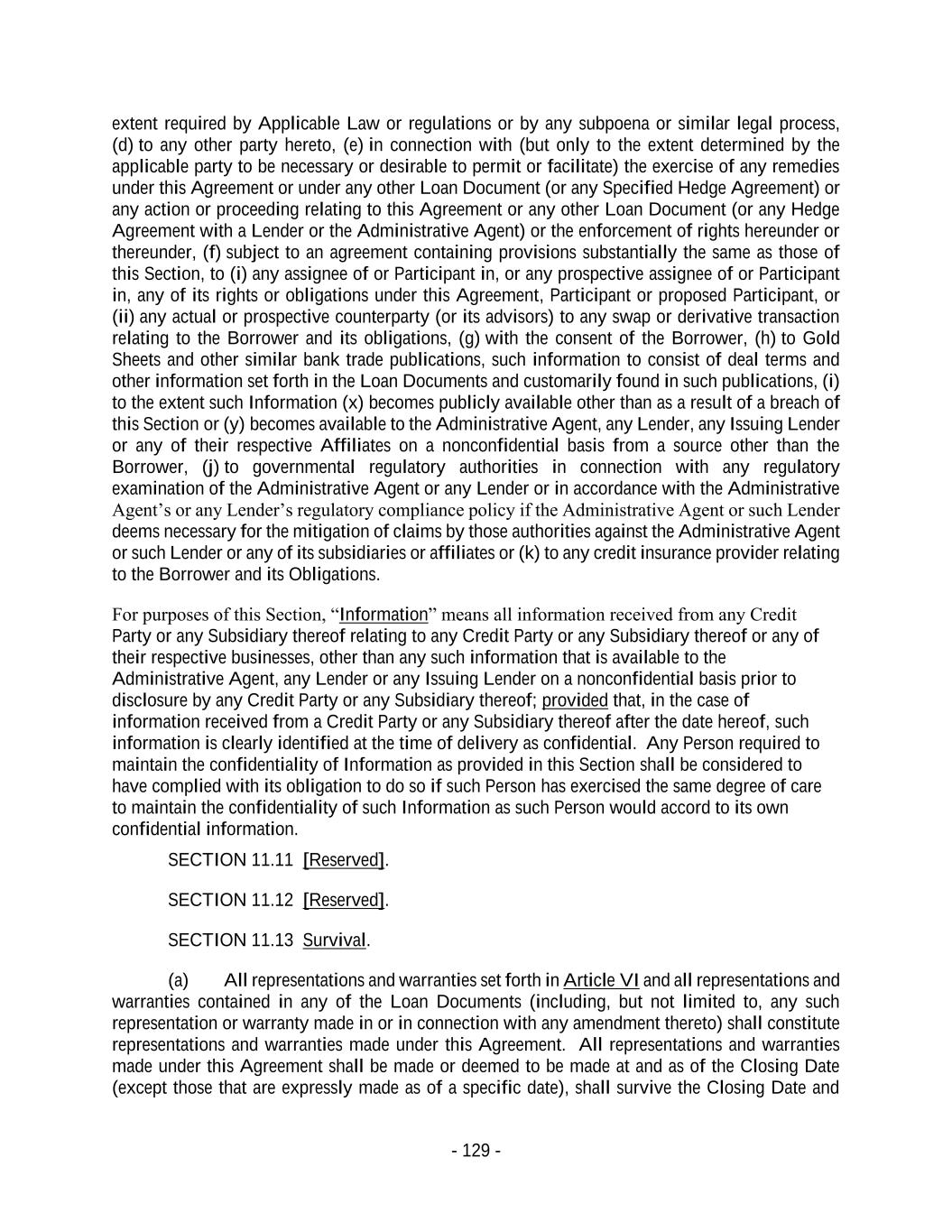 - 129 - extent required by Applicable Law or regulations or by any subpoena or similar legal process, (d) to any other party hereto, (e) in connection with (but only to the extent determined by the applicable party to be necessary or desirable to permit or facilitate) the exercise of any remedies under this Agreement or under any other Loan Document (or any Specified Hedge Agreement) or any action or proceeding relating to this Agreement or any other Loan Document (or any Hedge Agreement with a Lender or the Administrative Agent) or the enforcement of rights hereunder or thereunder, (f) subject to an agreement containing provisions substantially the same as those of this Section, to (i) any assignee of or Participant in, or any prospective assignee of or Participant in, any of its rights or obligations under this Agreement, Participant or proposed Participant, or (ii) any actual or prospective counterparty (or its advisors) to any swap or derivative transaction relating to the Borrower and its obligations, (g) with the consent of the Borrower, (h) to Gold Sheets and other similar bank trade publications, such information to consist of deal terms and other information set forth in the Loan Documents and customarily found in such publications, (i) to the extent such Information (x) becomes publicly available other than as a result of a breach of this Section or (y) becomes available to the Administrative Agent, any Lender, any Issuing Lender or any of their respective Affiliates on a nonconfidential basis from a source other than the Borrower, (j) to governmental regulatory authorities in connection with any regulatory examination of the Administrative Agent or any Lender or in accordance with the Administrative Agent’s or any Lender’s regulatory compliance policy if the Administrative Agent or such Lender deems necessary for the mitigation of claims by those authorities against the Administrative Agent or such Lender or any of its subsidiaries or affiliates or (k) to any credit insurance provider relating to the Borrower and its Obligations. For purposes of this Section, “Information” means all information received from any Credit Party or any Subsidiary thereof relating to any Credit Party or any Subsidiary thereof or any of their respective businesses, other than any such information that is available to the Administrative Agent, any Lender or any Issuing Lender on a nonconfidential basis prior to disclosure by any Credit Party or any Subsidiary thereof; provided that, in the case of information received from a Credit Party or any Subsidiary thereof after the date hereof, such information is clearly identified at the time of delivery as confidential. Any Person required to maintain the confidentiality of Information as provided in this Section shall be considered to have complied with its obligation to do so if such Person has exercised the same degree of care to maintain the confidentiality of such Information as such Person would accord to its own confidential information. SECTION 11.11 [Reserved]. SECTION 11.12 [Reserved]. SECTION 11.13 Survival. (a) All representations and warranties set forth in Article VI and all representations and warranties contained in any of the Loan Documents (including, but not limited to, any such representation or warranty made in or in connection with any amendment thereto) shall constitute representations and warranties made under this Agreement. All representations and warranties made under this Agreement shall be made or deemed to be made at and as of the Closing Date (except those that are expressly made as of a specific date), shall survive the Closing Date and