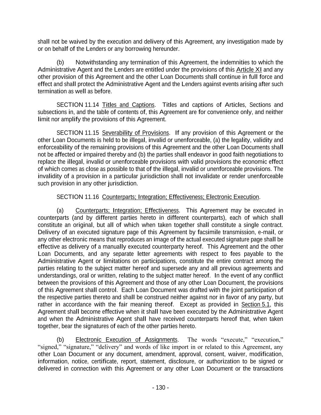 - 130 - shall not be waived by the execution and delivery of this Agreement, any investigation made by or on behalf of the Lenders or any borrowing hereunder. (b) Notwithstanding any termination of this Agreement, the indemnities to which the Administrative Agent and the Lenders are entitled under the provisions of this Article XI and any other provision of this Agreement and the other Loan Documents shall continue in full force and effect and shall protect the Administrative Agent and the Lenders against events arising after such termination as well as before. SECTION 11.14 Titles and Captions. Titles and captions of Articles, Sections and subsections in, and the table of contents of, this Agreement are for convenience only, and neither limit nor amplify the provisions of this Agreement. SECTION 11.15 Severability of Provisions. If any provision of this Agreement or the other Loan Documents is held to be illegal, invalid or unenforceable, (a) the legality, validity and enforceability of the remaining provisions of this Agreement and the other Loan Documents shall not be affected or impaired thereby and (b) the parties shall endeavor in good faith negotiations to replace the illegal, invalid or unenforceable provisions with valid provisions the economic effect of which comes as close as possible to that of the illegal, invalid or unenforceable provisions. The invalidity of a provision in a particular jurisdiction shall not invalidate or render unenforceable such provision in any other jurisdiction. SECTION 11.16 Counterparts; Integration; Effectiveness; Electronic Execution. (a) Counterparts; Integration; Effectiveness. This Agreement may be executed in counterparts (and by different parties hereto in different counterparts), each of which shall constitute an original, but all of which when taken together shall constitute a single contract. Delivery of an executed signature page of this Agreement by facsimile transmission, e-mail, or any other electronic means that reproduces an image of the actual executed signature page shall be effective as delivery of a manually executed counterparty hereof. This Agreement and the other Loan Documents, and any separate letter agreements with respect to fees payable to the Administrative Agent or limitations on participations, constitute the entire contract among the parties relating to the subject matter hereof and supersede any and all previous agreements and understandings, oral or written, relating to the subject matter hereof. In the event of any conflict between the provisions of this Agreement and those of any other Loan Document, the provisions of this Agreement shall control. Each Loan Document was drafted with the joint participation of the respective parties thereto and shall be construed neither against nor in favor of any party, but rather in accordance with the fair meaning thereof. Except as provided in Section 5.1, this Agreement shall become effective when it shall have been executed by the Administrative Agent and when the Administrative Agent shall have received counterparts hereof that, when taken together, bear the signatures of each of the other parties hereto. (b) Electronic Execution of Assignments. The words “execute,” “execution,” “signed,” “signature,” “delivery” and words of like import in or related to this Agreement, any other Loan Document or any document, amendment, approval, consent, waiver, modification, information, notice, certificate, report, statement, disclosure, or authorization to be signed or delivered in connection with this Agreement or any other Loan Document or the transactions