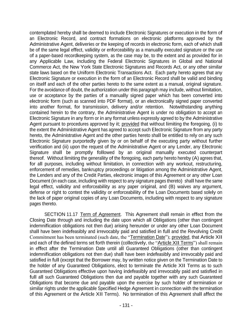 - 131 - contemplated hereby shall be deemed to include Electronic Signatures or execution in the form of an Electronic Record, and contract formations on electronic platforms approved by the Administrative Agent, deliveries or the keeping of records in electronic form, each of which shall be of the same legal effect, validity or enforceability as a manually executed signature or the use of a paper-based recordkeeping system, as the case may be, to the extent and as provided for in any Applicable Law, including the Federal Electronic Signatures in Global and National Commerce Act, the New York State Electronic Signatures and Records Act, or any other similar state laws based on the Uniform Electronic Transactions Act. Each party hereto agrees that any Electronic Signature or execution in the form of an Electronic Record shall be valid and binding on itself and each of the other parties hereto to the same extent as a manual, original signature. For the avoidance of doubt, the authorization under this paragraph may include, without limitation, use or acceptance by the parties of a manually signed paper which has been converted into electronic form (such as scanned into PDF format), or an electronically signed paper converted into another format, for transmission, delivery and/or retention. Notwithstanding anything contained herein to the contrary, the Administrative Agent is under no obligation to accept an Electronic Signature in any form or in any format unless expressly agreed to by the Administrative Agent pursuant to procedures approved by it; provided that without limiting the foregoing, (i) to the extent the Administrative Agent has agreed to accept such Electronic Signature from any party hereto, the Administrative Agent and the other parties hereto shall be entitled to rely on any such Electronic Signature purportedly given by or on behalf of the executing party without further verification and (ii) upon the request of the Administrative Agent or any Lender, any Electronic Signature shall be promptly followed by an original manually executed counterpart thereof. Without limiting the generality of the foregoing, each party hereto hereby (A) agrees that, for all purposes, including without limitation, in connection with any workout, restructuring, enforcement of remedies, bankruptcy proceedings or litigation among the Administrative Agent, the Lenders and any of the Credit Parties, electronic images of this Agreement or any other Loan Document (in each case, including with respect to any signature pages thereto) shall have the same legal effect, validity and enforceability as any paper original, and (B) waives any argument, defense or right to contest the validity or enforceability of the Loan Documents based solely on the lack of paper original copies of any Loan Documents, including with respect to any signature pages thereto. SECTION 11.17 Term of Agreement. This Agreement shall remain in effect from the Closing Date through and including the date upon which all Obligations (other than contingent indemnification obligations not then due) arising hereunder or under any other Loan Document shall have been indefeasibly and irrevocably paid and satisfied in full and the Revolving Credit Commitment has been terminated (such date, the “Termination Date”); provided, that Article XII and each of the defined terms set forth therein (collectively, the “Article XII Terms”) shall remain in effect after the Termination Date until all Guaranteed Obligations (other than contingent indemnification obligations not then due) shall have been indefeasibly and irrevocably paid and satisfied in full (except that the Borrower may, by written notice given on the Termination Date to the holder of any Guaranteed Obligations, elect to terminate the Article XII Terms as to such Guaranteed Obligations effective upon having indefeasibly and irrevocably paid and satisfied in full all such Guaranteed Obligations then due and payable together with any such Guaranteed Obligations that become due and payable upon the exercise by such holder of termination or similar rights under the applicable Specified Hedge Agreement in connection with the termination of this Agreement or the Article XII Terms). No termination of this Agreement shall affect the