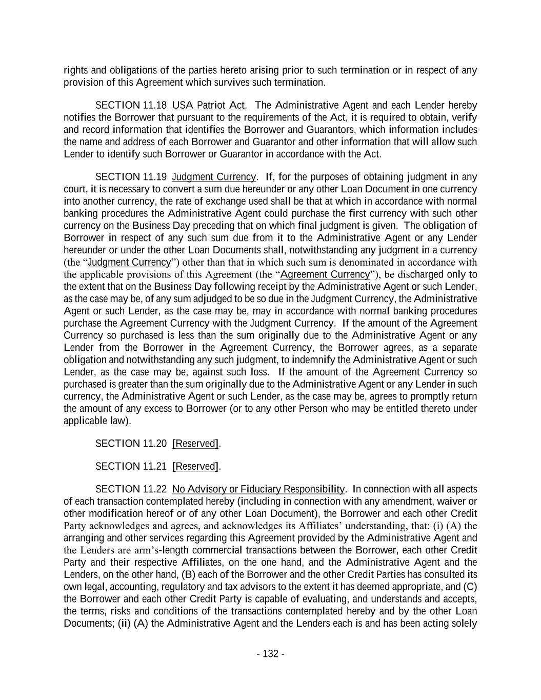 - 132 - rights and obligations of the parties hereto arising prior to such termination or in respect of any provision of this Agreement which survives such termination. SECTION 11.18 USA Patriot Act. The Administrative Agent and each Lender hereby notifies the Borrower that pursuant to the requirements of the Act, it is required to obtain, verify and record information that identifies the Borrower and Guarantors, which information includes the name and address of each Borrower and Guarantor and other information that will allow such Lender to identify such Borrower or Guarantor in accordance with the Act. SECTION 11.19 Judgment Currency. If, for the purposes of obtaining judgment in any court, it is necessary to convert a sum due hereunder or any other Loan Document in one currency into another currency, the rate of exchange used shall be that at which in accordance with normal banking procedures the Administrative Agent could purchase the first currency with such other currency on the Business Day preceding that on which final judgment is given. The obligation of Borrower in respect of any such sum due from it to the Administrative Agent or any Lender hereunder or under the other Loan Documents shall, notwithstanding any judgment in a currency (the “Judgment Currency”) other than that in which such sum is denominated in accordance with the applicable provisions of this Agreement (the “Agreement Currency”), be discharged only to the extent that on the Business Day following receipt by the Administrative Agent or such Lender, as the case may be, of any sum adjudged to be so due in the Judgment Currency, the Administrative Agent or such Lender, as the case may be, may in accordance with normal banking procedures purchase the Agreement Currency with the Judgment Currency. If the amount of the Agreement Currency so purchased is less than the sum originally due to the Administrative Agent or any Lender from the Borrower in the Agreement Currency, the Borrower agrees, as a separate obligation and notwithstanding any such judgment, to indemnify the Administrative Agent or such Lender, as the case may be, against such loss. If the amount of the Agreement Currency so purchased is greater than the sum originally due to the Administrative Agent or any Lender in such currency, the Administrative Agent or such Lender, as the case may be, agrees to promptly return the amount of any excess to Borrower (or to any other Person who may be entitled thereto under applicable law). SECTION 11.20 [Reserved]. SECTION 11.21 [Reserved]. SECTION 11.22 No Advisory or Fiduciary Responsibility. In connection with all aspects of each transaction contemplated hereby (including in connection with any amendment, waiver or other modification hereof or of any other Loan Document), the Borrower and each other Credit Party acknowledges and agrees, and acknowledges its Affiliates’ understanding, that: (i) (A) the arranging and other services regarding this Agreement provided by the Administrative Agent and the Lenders are arm’s-length commercial transactions between the Borrower, each other Credit Party and their respective Affiliates, on the one hand, and the Administrative Agent and the Lenders, on the other hand, (B) each of the Borrower and the other Credit Parties has consulted its own legal, accounting, regulatory and tax advisors to the extent it has deemed appropriate, and (C) the Borrower and each other Credit Party is capable of evaluating, and understands and accepts, the terms, risks and conditions of the transactions contemplated hereby and by the other Loan Documents; (ii) (A) the Administrative Agent and the Lenders each is and has been acting solely