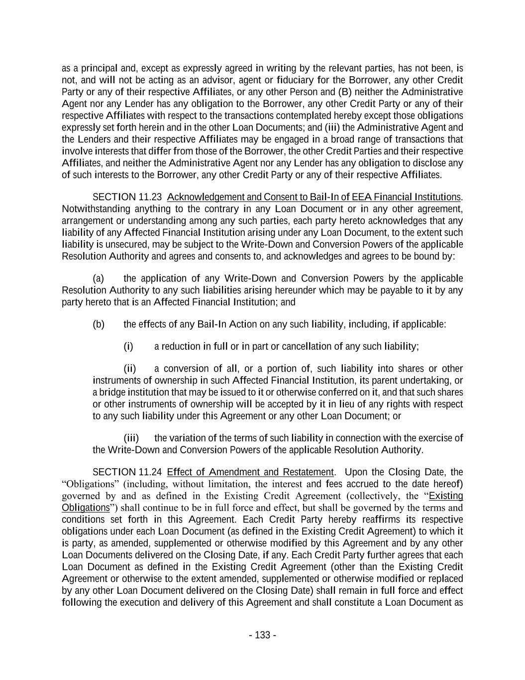 - 133 - as a principal and, except as expressly agreed in writing by the relevant parties, has not been, is not, and will not be acting as an advisor, agent or fiduciary for the Borrower, any other Credit Party or any of their respective Affiliates, or any other Person and (B) neither the Administrative Agent nor any Lender has any obligation to the Borrower, any other Credit Party or any of their respective Affiliates with respect to the transactions contemplated hereby except those obligations expressly set forth herein and in the other Loan Documents; and (iii) the Administrative Agent and the Lenders and their respective Affiliates may be engaged in a broad range of transactions that involve interests that differ from those of the Borrower, the other Credit Parties and their respective Affiliates, and neither the Administrative Agent nor any Lender has any obligation to disclose any of such interests to the Borrower, any other Credit Party or any of their respective Affiliates. SECTION 11.23 Acknowledgement and Consent to Bail-In of EEA Financial Institutions. Notwithstanding anything to the contrary in any Loan Document or in any other agreement, arrangement or understanding among any such parties, each party hereto acknowledges that any liability of any Affected Financial Institution arising under any Loan Document, to the extent such liability is unsecured, may be subject to the Write-Down and Conversion Powers of the applicable Resolution Authority and agrees and consents to, and acknowledges and agrees to be bound by: (a) the application of any Write-Down and Conversion Powers by the applicable Resolution Authority to any such liabilities arising hereunder which may be payable to it by any party hereto that is an Affected Financial Institution; and (b) the effects of any Bail-In Action on any such liability, including, if applicable: (i) a reduction in full or in part or cancellation of any such liability; (ii) a conversion of all, or a portion of, such liability into shares or other instruments of ownership in such Affected Financial Institution, its parent undertaking, or a bridge institution that may be issued to it or otherwise conferred on it, and that such shares or other instruments of ownership will be accepted by it in lieu of any rights with respect to any such liability under this Agreement or any other Loan Document; or (iii) the variation of the terms of such liability in connection with the exercise of the Write-Down and Conversion Powers of the applicable Resolution Authority. SECTION 11.24 Effect of Amendment and Restatement. Upon the Closing Date, the “Obligations” (including, without limitation, the interest and fees accrued to the date hereof) governed by and as defined in the Existing Credit Agreement (collectively, the “Existing Obligations”) shall continue to be in full force and effect, but shall be governed by the terms and conditions set forth in this Agreement. Each Credit Party hereby reaffirms its respective obligations under each Loan Document (as defined in the Existing Credit Agreement) to which it is party, as amended, supplemented or otherwise modified by this Agreement and by any other Loan Documents delivered on the Closing Date, if any. Each Credit Party further agrees that each Loan Document as defined in the Existing Credit Agreement (other than the Existing Credit Agreement or otherwise to the extent amended, supplemented or otherwise modified or replaced by any other Loan Document delivered on the Closing Date) shall remain in full force and effect following the execution and delivery of this Agreement and shall constitute a Loan Document as