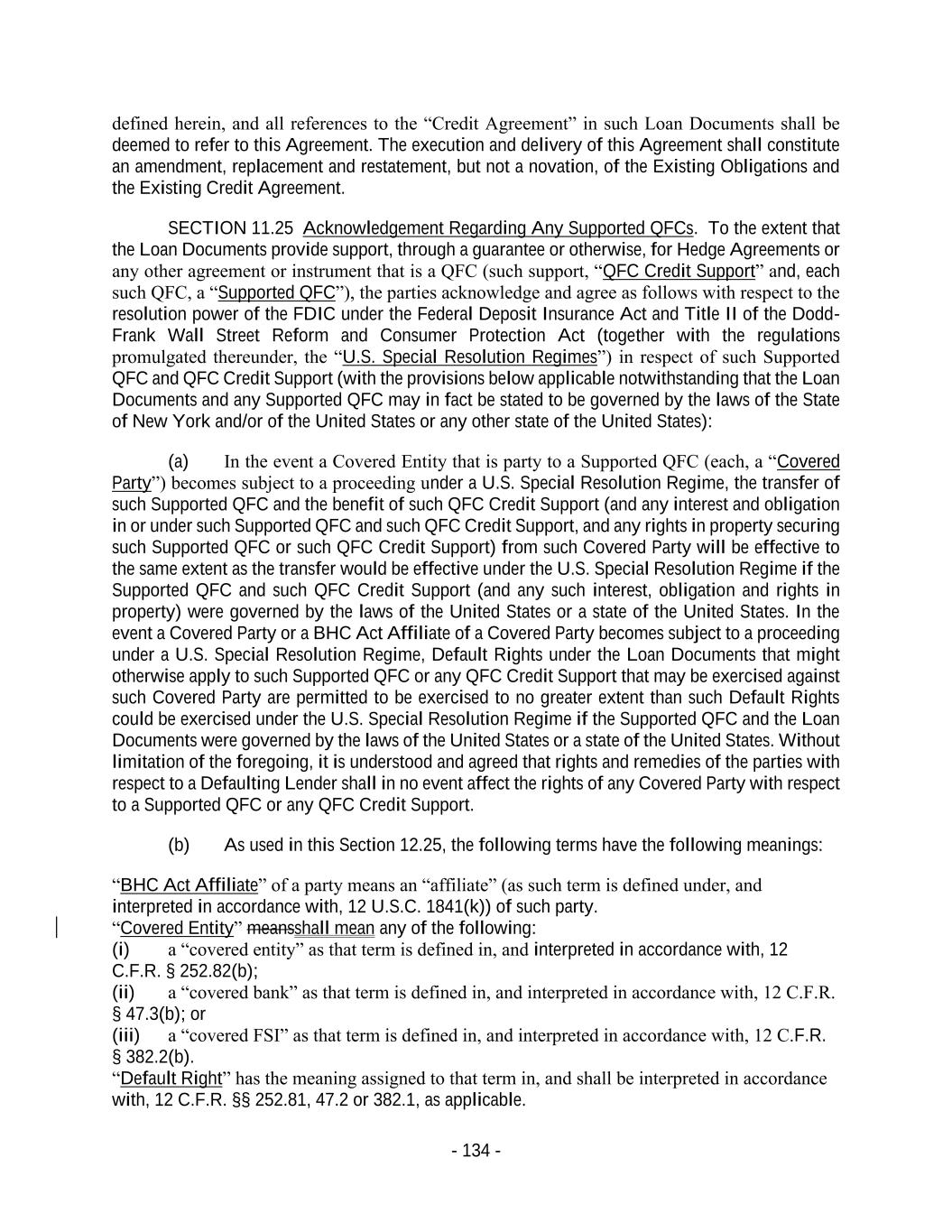 - 134 - defined herein, and all references to the “Credit Agreement” in such Loan Documents shall be deemed to refer to this Agreement. The execution and delivery of this Agreement shall constitute an amendment, replacement and restatement, but not a novation, of the Existing Obligations and the Existing Credit Agreement. SECTION 11.25 Acknowledgement Regarding Any Supported QFCs. To the extent that the Loan Documents provide support, through a guarantee or otherwise, for Hedge Agreements or any other agreement or instrument that is a QFC (such support, “QFC Credit Support” and, each such QFC, a “Supported QFC”), the parties acknowledge and agree as follows with respect to the resolution power of the FDIC under the Federal Deposit Insurance Act and Title II of the Dodd- Frank Wall Street Reform and Consumer Protection Act (together with the regulations promulgated thereunder, the “U.S. Special Resolution Regimes”) in respect of such Supported QFC and QFC Credit Support (with the provisions below applicable notwithstanding that the Loan Documents and any Supported QFC may in fact be stated to be governed by the laws of the State of New York and/or of the United States or any other state of the United States): (a) In the event a Covered Entity that is party to a Supported QFC (each, a “Covered Party”) becomes subject to a proceeding under a U.S. Special Resolution Regime, the transfer of such Supported QFC and the benefit of such QFC Credit Support (and any interest and obligation in or under such Supported QFC and such QFC Credit Support, and any rights in property securing such Supported QFC or such QFC Credit Support) from such Covered Party will be effective to the same extent as the transfer would be effective under the U.S. Special Resolution Regime if the Supported QFC and such QFC Credit Support (and any such interest, obligation and rights in property) were governed by the laws of the United States or a state of the United States. In the event a Covered Party or a BHC Act Affiliate of a Covered Party becomes subject to a proceeding under a U.S. Special Resolution Regime, Default Rights under the Loan Documents that might otherwise apply to such Supported QFC or any QFC Credit Support that may be exercised against such Covered Party are permitted to be exercised to no greater extent than such Default Rights could be exercised under the U.S. Special Resolution Regime if the Supported QFC and the Loan Documents were governed by the laws of the United States or a state of the United States. Without limitation of the foregoing, it is understood and agreed that rights and remedies of the parties with respect to a Defaulting Lender shall in no event affect the rights of any Covered Party with respect to a Supported QFC or any QFC Credit Support. (b) As used in this Section 12.25, the following terms have the following meanings: “BHC Act Affiliate” of a party means an “affiliate” (as such term is defined under, and interpreted in accordance with, 12 U.S.C. 1841(k)) of such party. “Covered Entity” meansshall mean any of the following: (i) a “covered entity” as that term is defined in, and interpreted in accordance with, 12 C.F.R. § 252.82(b); (ii) a “covered bank” as that term is defined in, and interpreted in accordance with, 12 C.F.R. § 47.3(b); or (iii) a “covered FSI” as that term is defined in, and interpreted in accordance with, 12 C.F.R. § 382.2(b). “Default Right” has the meaning assigned to that term in, and shall be interpreted in accordance with, 12 C.F.R. §§ 252.81, 47.2 or 382.1, as applicable.