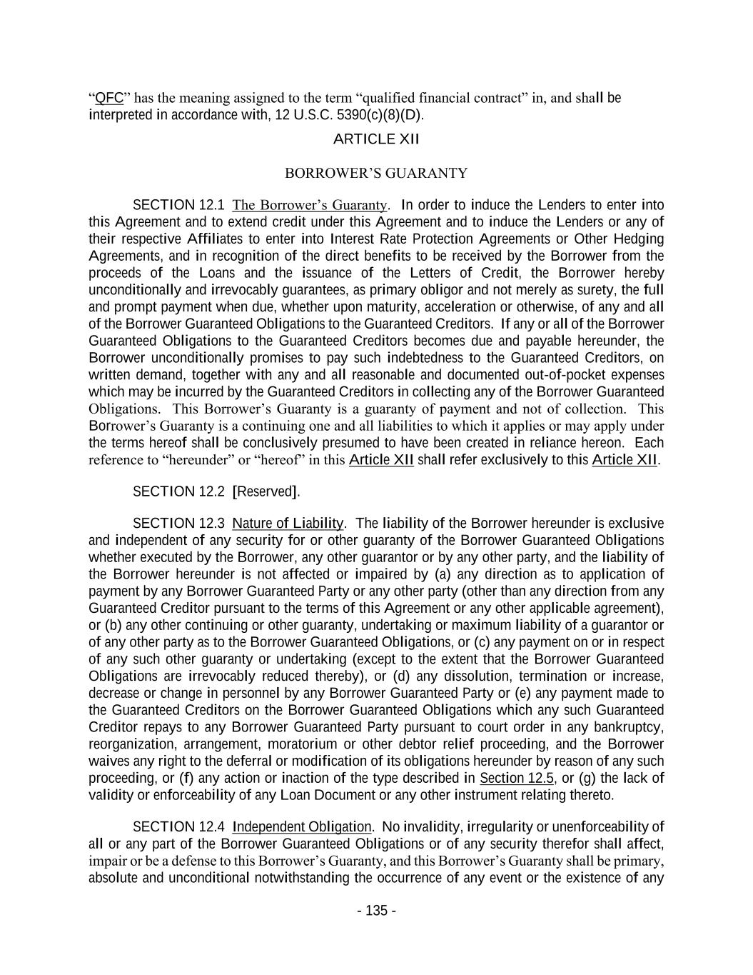 - 135 - “QFC” has the meaning assigned to the term “qualified financial contract” in, and shall be interpreted in accordance with, 12 U.S.C. 5390(c)(8)(D). ARTICLE XII BORROWER’S GUARANTY SECTION 12.1 The Borrower’s Guaranty. In order to induce the Lenders to enter into this Agreement and to extend credit under this Agreement and to induce the Lenders or any of their respective Affiliates to enter into Interest Rate Protection Agreements or Other Hedging Agreements, and in recognition of the direct benefits to be received by the Borrower from the proceeds of the Loans and the issuance of the Letters of Credit, the Borrower hereby unconditionally and irrevocably guarantees, as primary obligor and not merely as surety, the full and prompt payment when due, whether upon maturity, acceleration or otherwise, of any and all of the Borrower Guaranteed Obligations to the Guaranteed Creditors. If any or all of the Borrower Guaranteed Obligations to the Guaranteed Creditors becomes due and payable hereunder, the Borrower unconditionally promises to pay such indebtedness to the Guaranteed Creditors, on written demand, together with any and all reasonable and documented out-of-pocket expenses which may be incurred by the Guaranteed Creditors in collecting any of the Borrower Guaranteed Obligations. This Borrower’s Guaranty is a guaranty of payment and not of collection. This Borrower’s Guaranty is a continuing one and all liabilities to which it applies or may apply under the terms hereof shall be conclusively presumed to have been created in reliance hereon. Each reference to “hereunder” or “hereof” in this Article XII shall refer exclusively to this Article XII. SECTION 12.2 [Reserved]. SECTION 12.3 Nature of Liability. The liability of the Borrower hereunder is exclusive and independent of any security for or other guaranty of the Borrower Guaranteed Obligations whether executed by the Borrower, any other guarantor or by any other party, and the liability of the Borrower hereunder is not affected or impaired by (a) any direction as to application of payment by any Borrower Guaranteed Party or any other party (other than any direction from any Guaranteed Creditor pursuant to the terms of this Agreement or any other applicable agreement), or (b) any other continuing or other guaranty, undertaking or maximum liability of a guarantor or of any other party as to the Borrower Guaranteed Obligations, or (c) any payment on or in respect of any such other guaranty or undertaking (except to the extent that the Borrower Guaranteed Obligations are irrevocably reduced thereby), or (d) any dissolution, termination or increase, decrease or change in personnel by any Borrower Guaranteed Party or (e) any payment made to the Guaranteed Creditors on the Borrower Guaranteed Obligations which any such Guaranteed Creditor repays to any Borrower Guaranteed Party pursuant to court order in any bankruptcy, reorganization, arrangement, moratorium or other debtor relief proceeding, and the Borrower waives any right to the deferral or modification of its obligations hereunder by reason of any such proceeding, or (f) any action or inaction of the type described in Section 12.5, or (g) the lack of validity or enforceability of any Loan Document or any other instrument relating thereto. SECTION 12.4 Independent Obligation. No invalidity, irregularity or unenforceability of all or any part of the Borrower Guaranteed Obligations or of any security therefor shall affect, impair or be a defense to this Borrower’s Guaranty, and this Borrower’s Guaranty shall be primary, absolute and unconditional notwithstanding the occurrence of any event or the existence of any