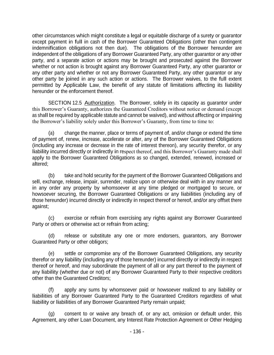 - 136 - other circumstances which might constitute a legal or equitable discharge of a surety or guarantor except payment in full in cash of the Borrower Guaranteed Obligations (other than contingent indemnification obligations not then due). The obligations of the Borrower hereunder are independent of the obligations of any Borrower Guaranteed Party, any other guarantor or any other party, and a separate action or actions may be brought and prosecuted against the Borrower whether or not action is brought against any Borrower Guaranteed Party, any other guarantor or any other party and whether or not any Borrower Guaranteed Party, any other guarantor or any other party be joined in any such action or actions. The Borrower waives, to the full extent permitted by Applicable Law, the benefit of any statute of limitations affecting its liability hereunder or the enforcement thereof. SECTION 12.5 Authorization. The Borrower, solely in its capacity as guarantor under this Borrower’s Guaranty, authorizes the Guaranteed Creditors without notice or demand (except as shall be required by applicable statute and cannot be waived), and without affecting or impairing the Borrower’s liability solely under this Borrower’s Guaranty, from time to time to: (a) change the manner, place or terms of payment of, and/or change or extend the time of payment of, renew, increase, accelerate or alter, any of the Borrower Guaranteed Obligations (including any increase or decrease in the rate of interest thereon), any security therefor, or any liability incurred directly or indirectly in respect thereof, and this Borrower’s Guaranty made shall apply to the Borrower Guaranteed Obligations as so changed, extended, renewed, increased or altered; (b) take and hold security for the payment of the Borrower Guaranteed Obligations and sell, exchange, release, impair, surrender, realize upon or otherwise deal with in any manner and in any order any property by whomsoever at any time pledged or mortgaged to secure, or howsoever securing, the Borrower Guaranteed Obligations or any liabilities (including any of those hereunder) incurred directly or indirectly in respect thereof or hereof, and/or any offset there against; (c) exercise or refrain from exercising any rights against any Borrower Guaranteed Party or others or otherwise act or refrain from acting; (d) release or substitute any one or more endorsers, guarantors, any Borrower Guaranteed Party or other obligors; (e) settle or compromise any of the Borrower Guaranteed Obligations, any security therefor or any liability (including any of those hereunder) incurred directly or indirectly in respect thereof or hereof, and may subordinate the payment of all or any part thereof to the payment of any liability (whether due or not) of any Borrower Guaranteed Party to their respective creditors other than the Guaranteed Creditors; (f) apply any sums by whomsoever paid or howsoever realized to any liability or liabilities of any Borrower Guaranteed Party to the Guaranteed Creditors regardless of what liability or liabilities of any Borrower Guaranteed Party remain unpaid; (g) consent to or waive any breach of, or any act, omission or default under, this Agreement, any other Loan Document, any Interest Rate Protection Agreement or Other Hedging