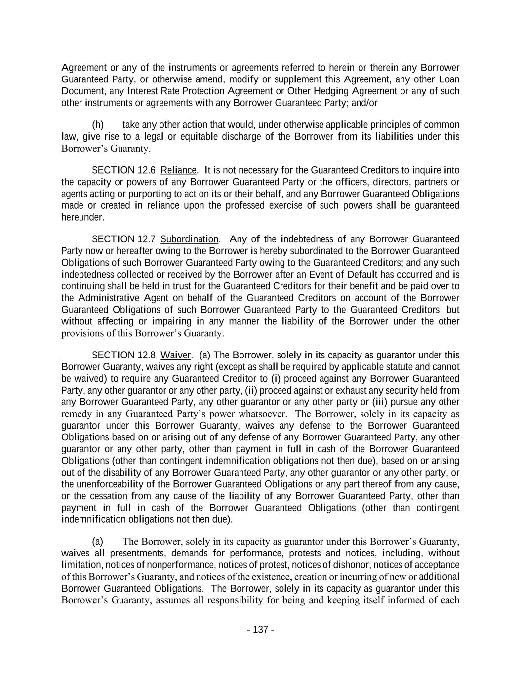 - 137 - Agreement or any of the instruments or agreements referred to herein or therein any Borrower Guaranteed Party, or otherwise amend, modify or supplement this Agreement, any other Loan Document, any Interest Rate Protection Agreement or Other Hedging Agreement or any of such other instruments or agreements with any Borrower Guaranteed Party; and/or (h) take any other action that would, under otherwise applicable principles of common law, give rise to a legal or equitable discharge of the Borrower from its liabilities under this Borrower’s Guaranty. SECTION 12.6 Reliance. It is not necessary for the Guaranteed Creditors to inquire into the capacity or powers of any Borrower Guaranteed Party or the officers, directors, partners or agents acting or purporting to act on its or their behalf, and any Borrower Guaranteed Obligations made or created in reliance upon the professed exercise of such powers shall be guaranteed hereunder. SECTION 12.7 Subordination. Any of the indebtedness of any Borrower Guaranteed Party now or hereafter owing to the Borrower is hereby subordinated to the Borrower Guaranteed Obligations of such Borrower Guaranteed Party owing to the Guaranteed Creditors; and any such indebtedness collected or received by the Borrower after an Event of Default has occurred and is continuing shall be held in trust for the Guaranteed Creditors for their benefit and be paid over to the Administrative Agent on behalf of the Guaranteed Creditors on account of the Borrower Guaranteed Obligations of such Borrower Guaranteed Party to the Guaranteed Creditors, but without affecting or impairing in any manner the liability of the Borrower under the other provisions of this Borrower’s Guaranty. SECTION 12.8 Waiver. (a) The Borrower, solely in its capacity as guarantor under this Borrower Guaranty, waives any right (except as shall be required by applicable statute and cannot be waived) to require any Guaranteed Creditor to (i) proceed against any Borrower Guaranteed Party, any other guarantor or any other party, (ii) proceed against or exhaust any security held from any Borrower Guaranteed Party, any other guarantor or any other party or (iii) pursue any other remedy in any Guaranteed Party’s power whatsoever. The Borrower, solely in its capacity as guarantor under this Borrower Guaranty, waives any defense to the Borrower Guaranteed Obligations based on or arising out of any defense of any Borrower Guaranteed Party, any other guarantor or any other party, other than payment in full in cash of the Borrower Guaranteed Obligations (other than contingent indemnification obligations not then due), based on or arising out of the disability of any Borrower Guaranteed Party, any other guarantor or any other party, or the unenforceability of the Borrower Guaranteed Obligations or any part thereof from any cause, or the cessation from any cause of the liability of any Borrower Guaranteed Party, other than payment in full in cash of the Borrower Guaranteed Obligations (other than contingent indemnification obligations not then due). (a) The Borrower, solely in its capacity as guarantor under this Borrower’s Guaranty, waives all presentments, demands for performance, protests and notices, including, without limitation, notices of nonperformance, notices of protest, notices of dishonor, notices of acceptance of this Borrower’s Guaranty, and notices of the existence, creation or incurring of new or additional Borrower Guaranteed Obligations. The Borrower, solely in its capacity as guarantor under this Borrower’s Guaranty, assumes all responsibility for being and keeping itself informed of each