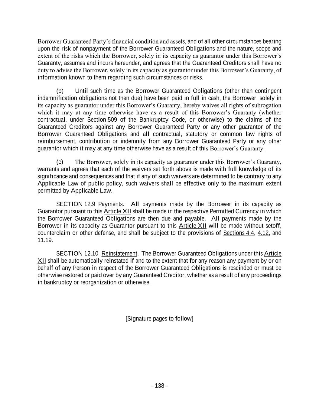- 138 - Borrower Guaranteed Party’s financial condition and assets, and of all other circumstances bearing upon the risk of nonpayment of the Borrower Guaranteed Obligations and the nature, scope and extent of the risks which the Borrower, solely in its capacity as guarantor under this Borrower’s Guaranty, assumes and incurs hereunder, and agrees that the Guaranteed Creditors shall have no duty to advise the Borrower, solely in its capacity as guarantor under this Borrower’s Guaranty, of information known to them regarding such circumstances or risks. (b) Until such time as the Borrower Guaranteed Obligations (other than contingent indemnification obligations not then due) have been paid in full in cash, the Borrower, solely in its capacity as guarantor under this Borrower’s Guaranty, hereby waives all rights of subrogation which it may at any time otherwise have as a result of this Borrower’s Guaranty (whether contractual, under Section 509 of the Bankruptcy Code, or otherwise) to the claims of the Guaranteed Creditors against any Borrower Guaranteed Party or any other guarantor of the Borrower Guaranteed Obligations and all contractual, statutory or common law rights of reimbursement, contribution or indemnity from any Borrower Guaranteed Party or any other guarantor which it may at any time otherwise have as a result of this Borrower’s Guaranty. (c) The Borrower, solely in its capacity as guarantor under this Borrower’s Guaranty, warrants and agrees that each of the waivers set forth above is made with full knowledge of its significance and consequences and that if any of such waivers are determined to be contrary to any Applicable Law of public policy, such waivers shall be effective only to the maximum extent permitted by Applicable Law. SECTION 12.9 Payments. All payments made by the Borrower in its capacity as Guarantor pursuant to this Article XII shall be made in the respective Permitted Currency in which the Borrower Guaranteed Obligations are then due and payable. All payments made by the Borrower in its capacity as Guarantor pursuant to this Article XII will be made without setoff, counterclaim or other defense, and shall be subject to the provisions of Sections 4.4, 4.12, and 11.19. SECTION 12.10 Reinstatement. The Borrower Guaranteed Obligations under this Article XII shall be automatically reinstated if and to the extent that for any reason any payment by or on behalf of any Person in respect of the Borrower Guaranteed Obligations is rescinded or must be otherwise restored or paid over by any Guaranteed Creditor, whether as a result of any proceedings in bankruptcy or reorganization or otherwise. [Signature pages to follow]