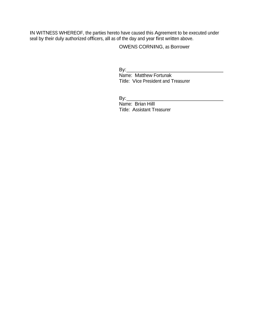 IN WITNESS WHEREOF, the parties hereto have caused this Agreement to be executed under seal by their duly authorized officers, all as of the day and year first written above. OWENS CORNING, as Borrower By: _______________________________________ Name: Matthew Fortunak Title: Vice President and Treasurer By: _______________________________________ Name: Brian Hill Title: Assistant Treasurer