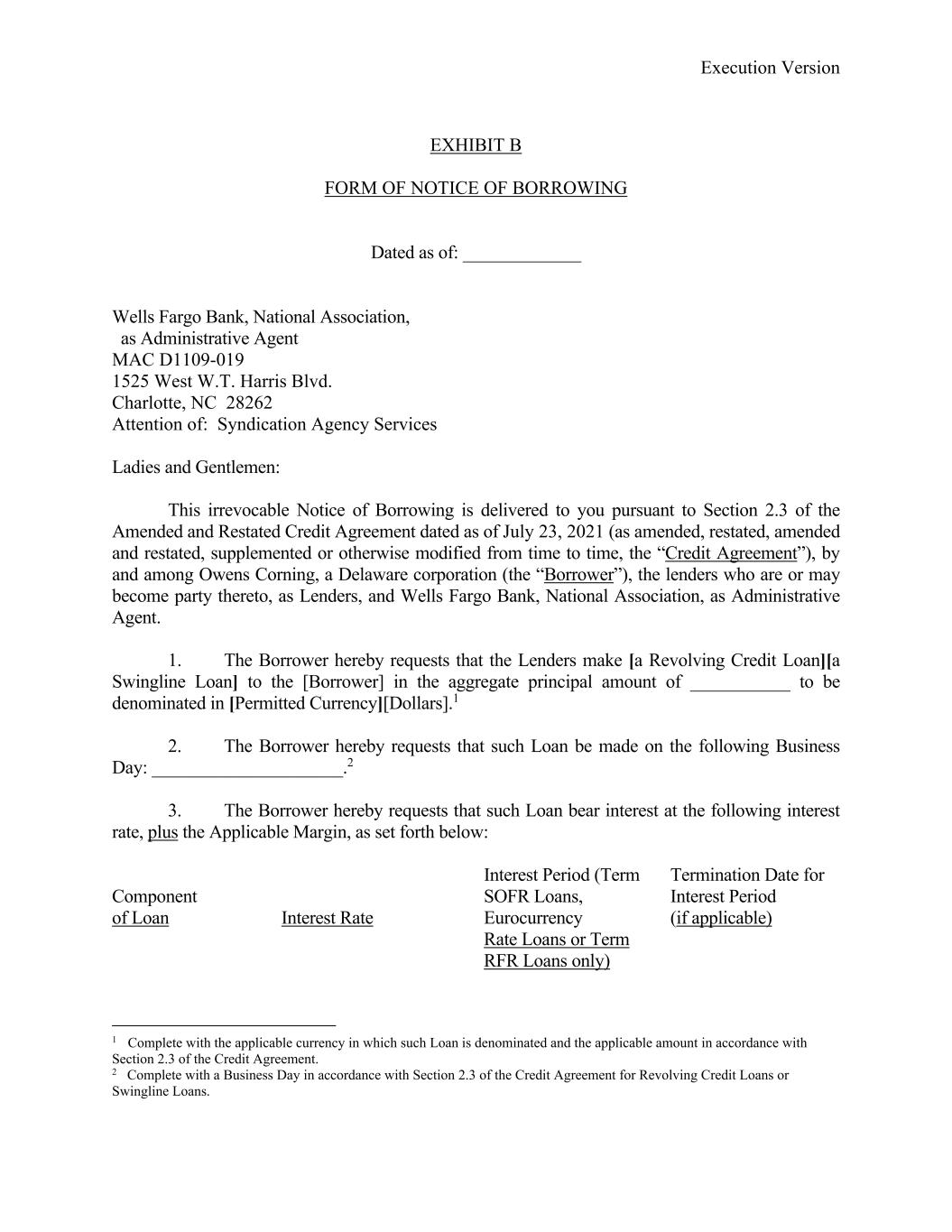 Execution Version EXHIBIT B FORM OF NOTICE OF BORROWING Dated as of: _____________ Wells Fargo Bank, National Association, as Administrative Agent MAC D1109-019 1525 West W.T. Harris Blvd. Charlotte, NC 28262 Attention of: Syndication Agency Services Ladies and Gentlemen: This irrevocable Notice of Borrowing is delivered to you pursuant to Section 2.3 of the Amended and Restated Credit Agreement dated as of July 23, 2021 (as amended, restated, amended and restated, supplemented or otherwise modified from time to time, the “Credit Agreement”), by and among Owens Corning, a Delaware corporation (the “Borrower”), the lenders who are or may become party thereto, as Lenders, and Wells Fargo Bank, National Association, as Administrative Agent. 1. The Borrower hereby requests that the Lenders make [a Revolving Credit Loan][a Swingline Loan] to the [Borrower] in the aggregate principal amount of ___________ to be denominated in [Permitted Currency][Dollars].1 2. The Borrower hereby requests that such Loan be made on the following Business Day: _____________________.2 3. The Borrower hereby requests that such Loan bear interest at the following interest rate, plus the Applicable Margin, as set forth below: Component of Loan Interest Rate Interest Period (Term SOFR Loans, Eurocurrency Rate Loans or Term RFR Loans only) Termination Date for Interest Period (if applicable) 1 Complete with the applicable currency in which such Loan is denominated and the applicable amount in accordance with Section 2.3 of the Credit Agreement. 2 Complete with a Business Day in accordance with Section 2.3 of the Credit Agreement for Revolving Credit Loans or Swingline Loans.