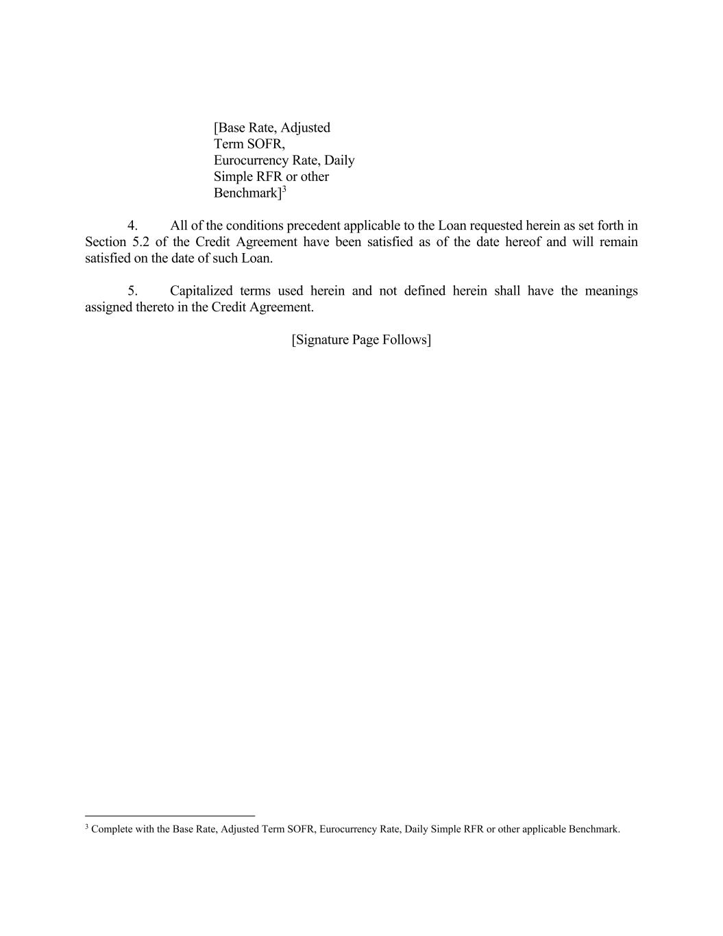 4. All of the conditions precedent applicable to the Loan requested herein as set forth in Section 5.2 of the Credit Agreement have been satisfied as of the date hereof and will remain satisfied on the date of such Loan. 5. Capitalized terms used herein and not defined herein shall have the meanings assigned thereto in the Credit Agreement. [Signature Page Follows] 3 Complete with the Base Rate, Adjusted Term SOFR, Eurocurrency Rate, Daily Simple RFR or other applicable Benchmark. [Base Rate, Adjusted Term SOFR, Eurocurrency Rate, Daily Simple RFR or other Benchmark]3