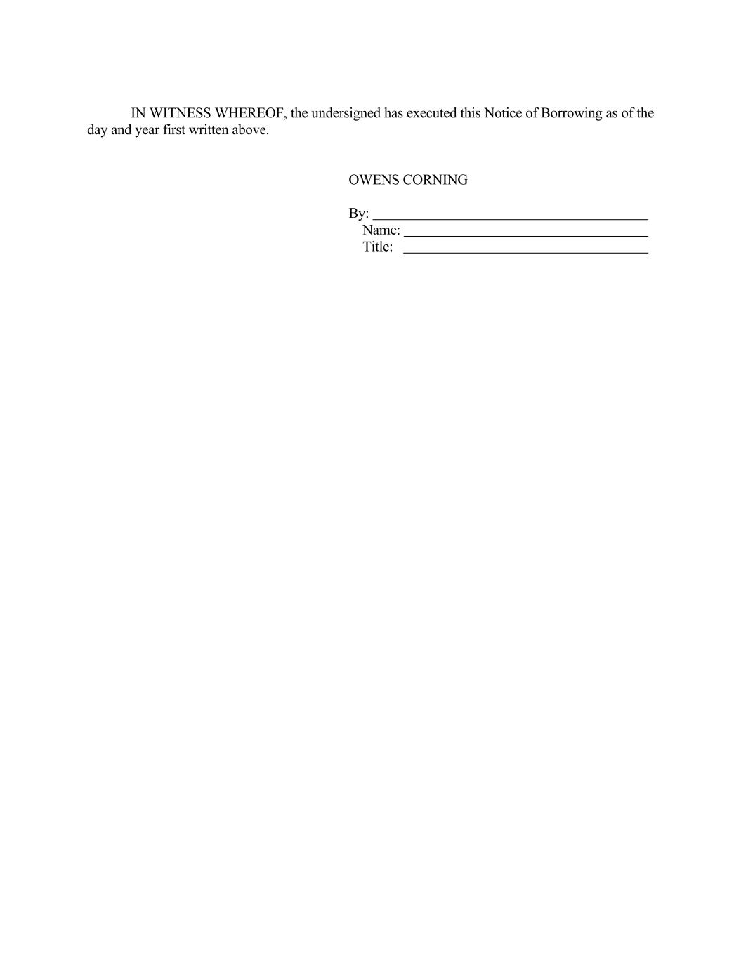 IN WITNESS WHEREOF, the undersigned has executed this Notice of Borrowing as of the day and year first written above. OWENS CORNING By: Name: Title: