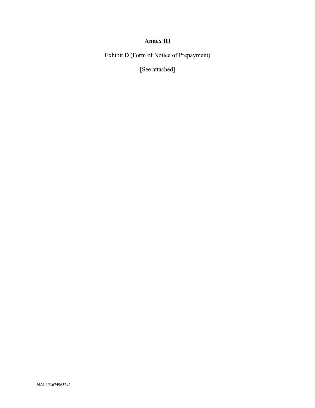 NAI-1536749632v2 Annex III Exhibit D (Form of Notice of Prepayment) [See attached]
