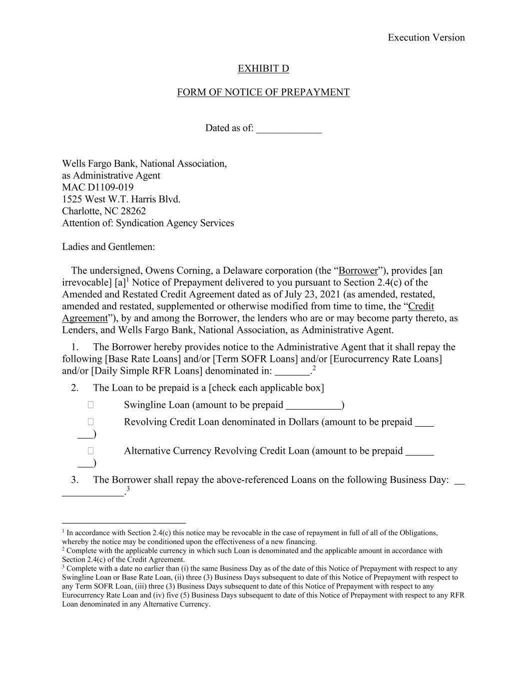 Execution Version EXHIBIT D FORM OF NOTICE OF PREPAYMENT Dated as of: _____________ Wells Fargo Bank, National Association, as Administrative Agent MAC D1109-019 1525 West W.T. Harris Blvd. Charlotte, NC 28262 Attention of: Syndication Agency Services Ladies and Gentlemen: The undersigned, Owens Corning, a Delaware corporation (the “Borrower”), provides [an irrevocable] [a]1 Notice of Prepayment delivered to you pursuant to Section 2.4(c) of the Amended and Restated Credit Agreement dated as of July 23, 2021 (as amended, restated, amended and restated, supplemented or otherwise modified from time to time, the “Credit Agreement”), by and among the Borrower, the lenders who are or may become party thereto, as Lenders, and Wells Fargo Bank, National Association, as Administrative Agent. 1. The Borrower hereby provides notice to the Administrative Agent that it shall repay the following [Base Rate Loans] and/or [Term SOFR Loans] and/or [Eurocurrency Rate Loans] and/or [Daily Simple RFR Loans] denominated in: .2 2. The Loan to be prepaid is a [check each applicable box]  Swingline Loan (amount to be prepaid )  Revolving Credit Loan denominated in Dollars (amount to be prepaid )  Alternative Currency Revolving Credit Loan (amount to be prepaid ) 3. The Borrower shall repay the above-referenced Loans on the following Business Day: .3 1 In accordance with Section 2.4(c) this notice may be revocable in the case of repayment in full of all of the Obligations, whereby the notice may be conditioned upon the effectiveness of a new financing. 2 Complete with the applicable currency in which such Loan is denominated and the applicable amount in accordance with Section 2.4(c) of the Credit Agreement. 3 Complete with a date no earlier than (i) the same Business Day as of the date of this Notice of Prepayment with respect to any Swingline Loan or Base Rate Loan, (ii) three (3) Business Days subsequent to date of this Notice of Prepayment with respect to any Term SOFR Loan, (iii) three (3) Business Days subsequent to date of this Notice of Prepayment with respect to any Eurocurrency Rate Loan and (iv) five (5) Business Days subsequent to date of this Notice of Prepayment with respect to any RFR Loan denominated in any Alternative Currency.