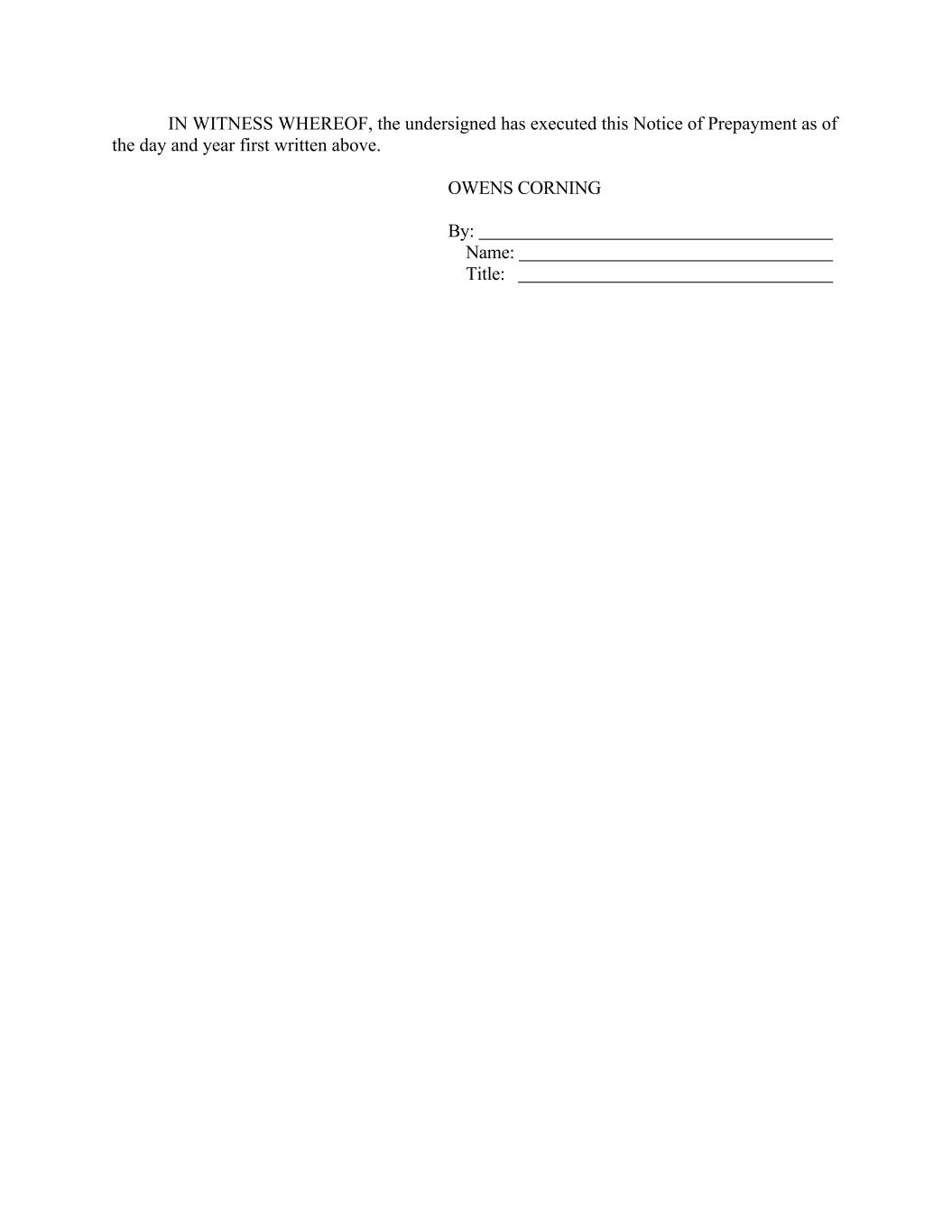 IN WITNESS WHEREOF, the undersigned has executed this Notice of Prepayment as of the day and year first written above. OWENS CORNING By: Name: Title: