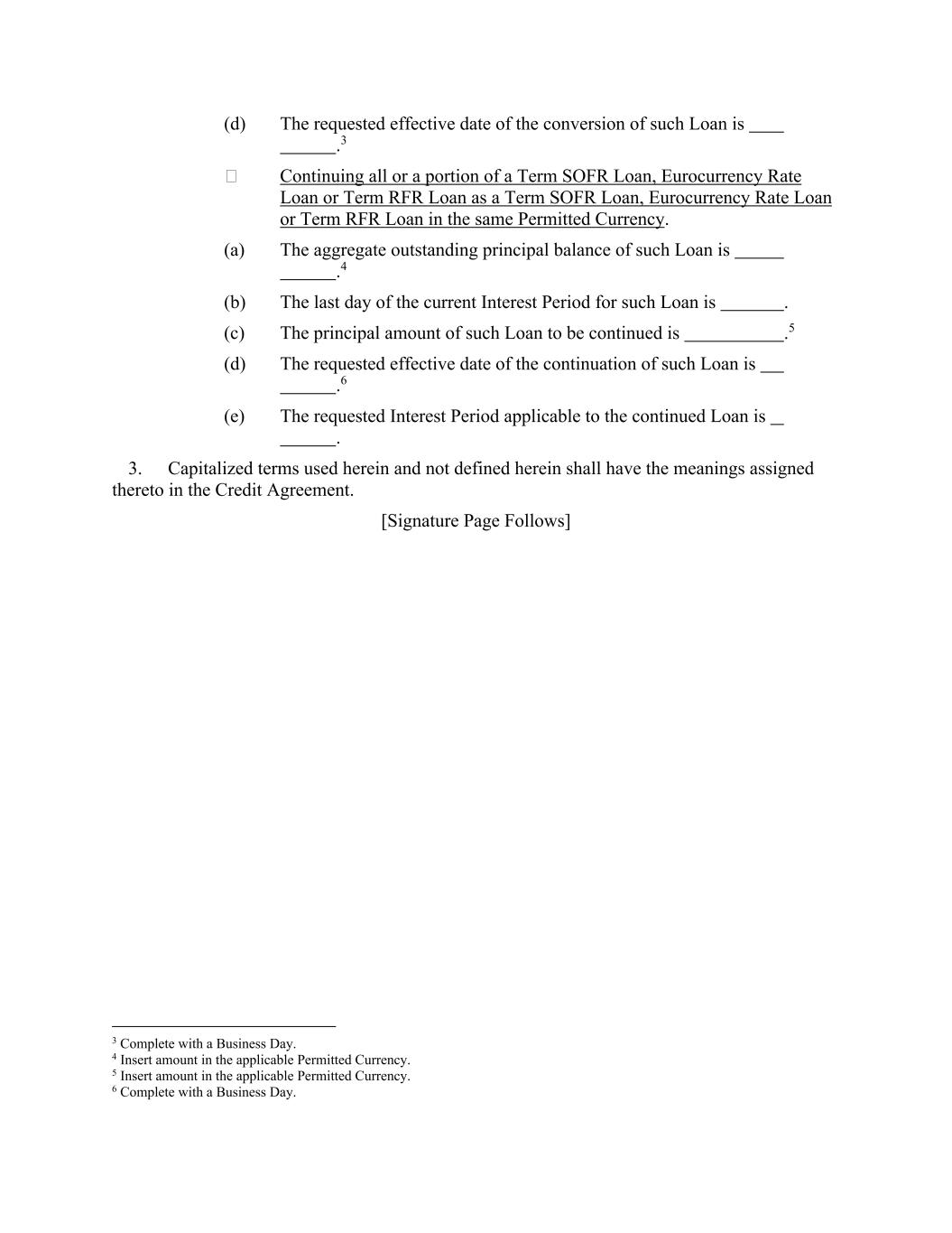 (d) The requested effective date of the conversion of such Loan is .3  Continuing all or a portion of a Term SOFR Loan, Eurocurrency Rate Loan or Term RFR Loan as a Term SOFR Loan, Eurocurrency Rate Loan or Term RFR Loan in the same Permitted Currency. (a) The aggregate outstanding principal balance of such Loan is .4 (b) The last day of the current Interest Period for such Loan is . (c) The principal amount of such Loan to be continued is .5 (d) The requested effective date of the continuation of such Loan is .6 (e) The requested Interest Period applicable to the continued Loan is . 3. Capitalized terms used herein and not defined herein shall have the meanings assigned thereto in the Credit Agreement. [Signature Page Follows] 3 Complete with a Business Day. 4 Insert amount in the applicable Permitted Currency. 5 Insert amount in the applicable Permitted Currency. 6 Complete with a Business Day.