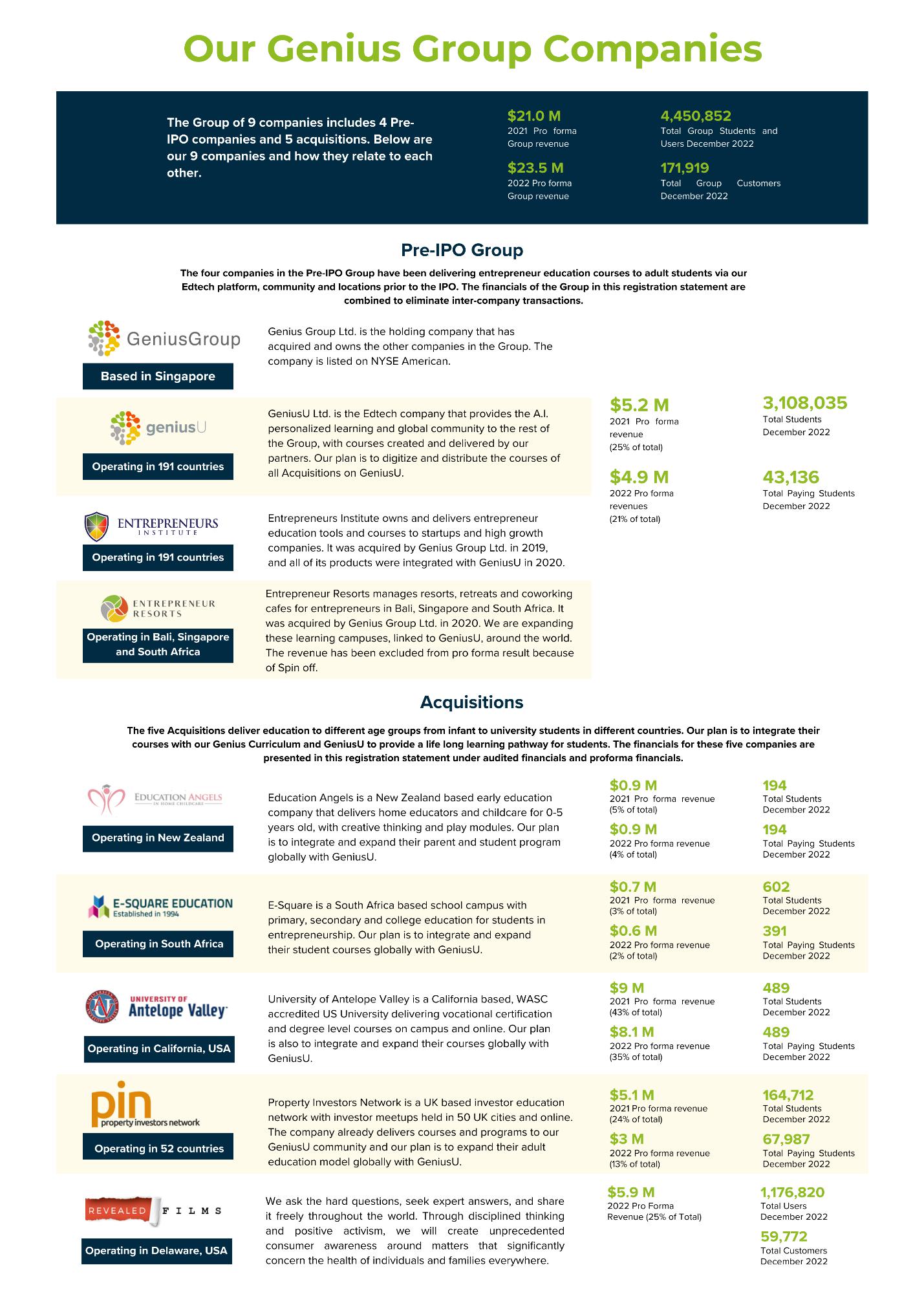 Except where indicated or where the context otherwise requires, the terms “Genius Group,” “we,” “us,” “our,” the “Company,” “our Company”, “company” and “our business” refer to Genius Group Limited together with its consolidated subsidiaries. For explanations of certain other terms used in this prospectus, please read “Prospectus Summary — Overview — A Brief Glossary” beginning on page S-3.
