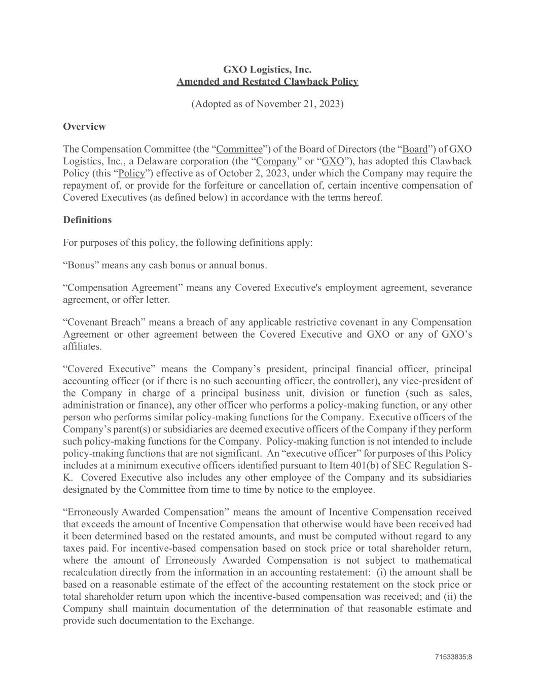 71533835;8 GXO Logistics, Inc. Amended and Restated Clawback Policy (Adopted as of November 21, 2023) Overview The Compensation Committee (the “Committee”) of the Board of Directors (the “Board”) of GXO Logistics, Inc., a Delaware corporation (the “Company” or “GXO”), has adopted this Clawback Policy (this “Policy”) effective as of October 2, 2023, under which the Company may require the repayment of, or provide for the forfeiture or cancellation of, certain incentive compensation of Covered Executives (as defined below) in accordance with the terms hereof. Definitions For purposes of this policy, the following definitions apply: “Bonus” means any cash bonus or annual bonus. “Compensation Agreement” means any Covered Executive's employment agreement, severance agreement, or offer letter. “Covenant Breach” means a breach of any applicable restrictive covenant in any Compensation Agreement or other agreement between the Covered Executive and GXO or any of GXO’s affiliates. “Covered Executive” means the Company’s president, principal financial officer, principal accounting officer (or if there is no such accounting officer, the controller), any vice-president of the Company in charge of a principal business unit, division or function (such as sales, administration or finance), any other officer who performs a policy-making function, or any other person who performs similar policy-making functions for the Company. Executive officers of the Company’s parent(s) or subsidiaries are deemed executive officers of the Company if they perform such policy-making functions for the Company. Policy-making function is not intended to include policy-making functions that are not significant. An “executive officer” for purposes of this Policy includes at a minimum executive officers identified pursuant to Item 401(b) of SEC Regulation S- K. Covered Executive also includes any other employee of the Company and its subsidiaries designated by the Committee from time to time by notice to the employee. “Erroneously Awarded Compensation” means the amount of Incentive Compensation received that exceeds the amount of Incentive Compensation that otherwise would have been received had it been determined based on the restated amounts, and must be computed without regard to any taxes paid. For incentive-based compensation based on stock price or total shareholder return, where the amount of Erroneously Awarded Compensation is not subject to mathematical recalculation directly from the information in an accounting restatement: (i) the amount shall be based on a reasonable estimate of the effect of the accounting restatement on the stock price or total shareholder return upon which the incentive-based compensation was received; and (ii) the Company shall maintain documentation of the determination of that reasonable estimate and provide such documentation to the Exchange.