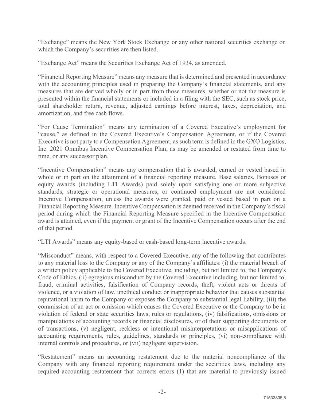 -2- 71533835;8 “Exchange” means the New York Stock Exchange or any other national securities exchange on which the Company’s securities are then listed. “Exchange Act” means the Securities Exchange Act of 1934, as amended. “Financial Reporting Measure” means any measure that is determined and presented in accordance with the accounting principles used in preparing the Company’s financial statements, and any measures that are derived wholly or in part from those measures, whether or not the measure is presented within the financial statements or included in a filing with the SEC, such as stock price, total shareholder return, revenue, adjusted earnings before interest, taxes, depreciation, and amortization, and free cash flows. “For Cause Termination” means any termination of a Covered Executive’s employment for “cause,” as defined in the Covered Executive’s Compensation Agreement, or if the Covered Executive is not party to a Compensation Agreement, as such term is defined in the GXO Logistics, Inc. 2021 Omnibus Incentive Compensation Plan, as may be amended or restated from time to time, or any successor plan. “Incentive Compensation” means any compensation that is awarded, earned or vested based in whole or in part on the attainment of a financial reporting measure. Base salaries, Bonuses or equity awards (including LTI Awards) paid solely upon satisfying one or more subjective standards, strategic or operational measures, or continued employment are not considered Incentive Compensation, unless the awards were granted, paid or vested based in part on a Financial Reporting Measure. Incentive Compensation is deemed received in the Company’s fiscal period during which the Financial Reporting Measure specified in the Incentive Compensation award is attained, even if the payment or grant of the Incentive Compensation occurs after the end of that period. “LTI Awards” means any equity-based or cash-based long-term incentive awards. “Misconduct” means, with respect to a Covered Executive, any of the following that contributes to any material loss to the Company or any of the Company’s affiliates: (i) the material breach of a written policy applicable to the Covered Executive, including, but not limited to, the Company's Code of Ethics, (ii) egregious misconduct by the Covered Executive including, but not limited to, fraud, criminal activities, falsification of Company records, theft, violent acts or threats of violence, or a violation of law, unethical conduct or inappropriate behavior that causes substantial reputational harm to the Company or exposes the Company to substantial legal liability, (iii) the commission of an act or omission which causes the Covered Executive or the Company to be in violation of federal or state securities laws, rules or regulations, (iv) falsifications, omissions or manipulations of accounting records or financial disclosures, or of their supporting documents or of transactions, (v) negligent, reckless or intentional misinterpretations or misapplications of accounting requirements, rules, guidelines, standards or principles, (vi) non-compliance with internal controls and procedures, or (vii) negligent supervision. “Restatement” means an accounting restatement due to the material noncompliance of the Company with any financial reporting requirement under the securities laws, including any required accounting restatement that corrects errors (1) that are material to previously issued